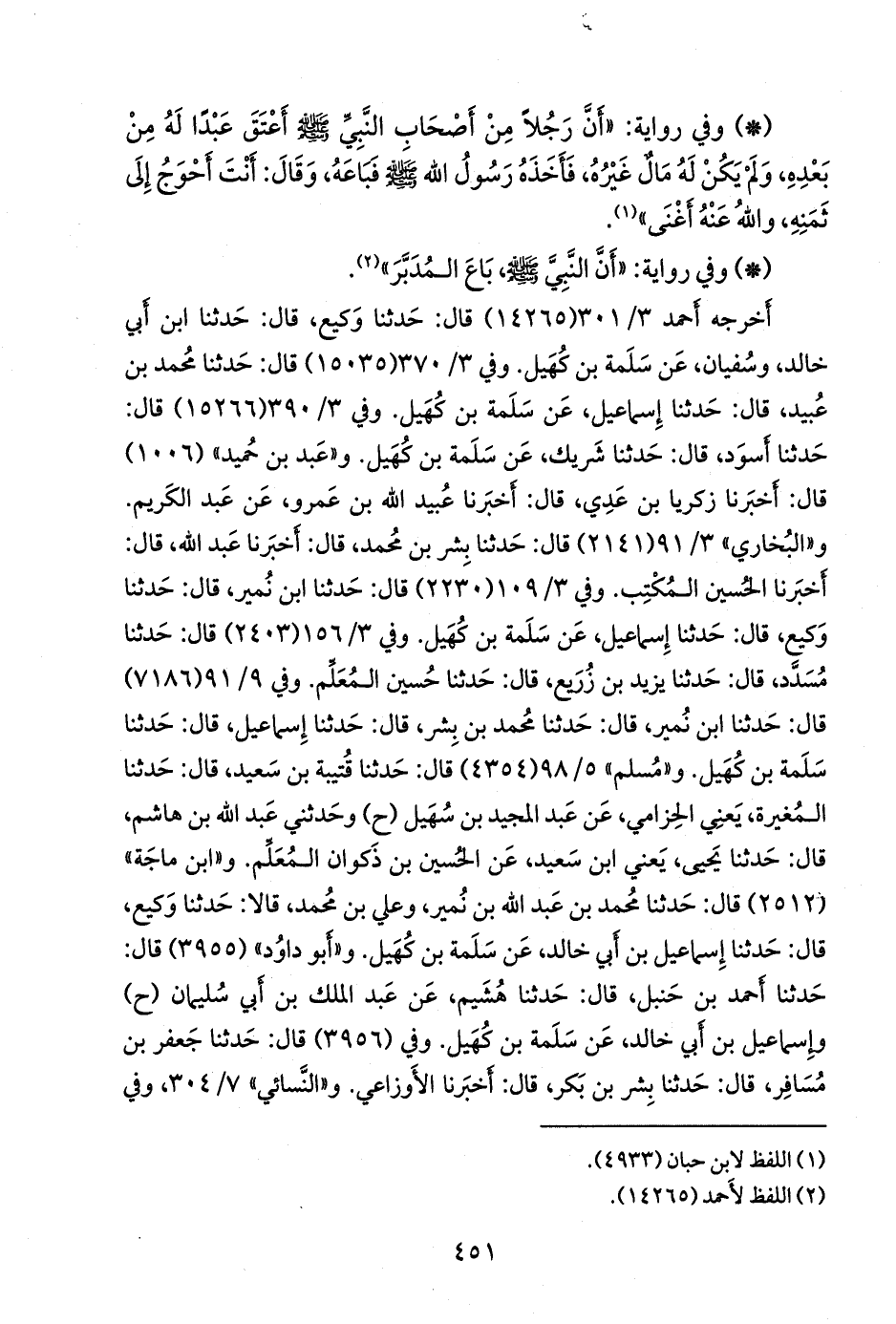 أخرجه أحمد (١٤٢٦٥) قال: حدثنا وكيع، قال: حدثنا ابن أبي خالد، وسفيان، عن سلمة بن كهيل. وفي ٣/ ٣٧٠ (١٥٠٣٥) قال: حدثنا محمد بن عبيد، قال: حدثنا إسماعيل، عن سلمة بن كهيل. وفي ٣/ ٣٩٠ (١٥٢٦٦) قال: حدثنا أسود، قال: حدثنا شَريك، عن سلمة بن كهيل. و «عَبد بن حُميد» (١٠٠٦) قال: أخبرنا زكريا بن عَدي، قال: أخبرنا عُبيد الله بن عَمرو، عن عبد الكريم. و «البخاري» ٣/ ٦٩ (٢١٤١) قال: حدثنا بشر بن محمد، قال: أخبرنا عبد الله، قال: أخبرنا الحسين المكتب. وفي ٣/ ٨٣ (٢٢٣٠) قال: حدثنا ابن نُمير، قال: حدثنا وكيع، قال: حدثنا إسماعيل، عن سلمة بن كهيل. وفي ٣/ ١١٩ (٢٤٠٣) قال: حدثنا مُسدد، قال: حدثنا يزيد بن زُريع، قال: حدثنا حسين المُعَلِّم. وفي ٩/ ٧٣ (٧١٨٦) قال: حدثنا ابن نُمير، قال: حدثنا محمد بن بشر، قال: حدثنا إسماعيل، قال: حدثنا سلمة بن كهيل. و «مسلم» ٥/ ٩٨ (٤٣٥٤) قال: حدثنا قتيبة بن سعيد، قال: حدثنا المغيرة، يعني الحزامي، عن عبد المجيد بن سهيل (ح) وحدثني عبد الله بن هاشم، قال: حدثنا يحيى، يعني ابن سعيد، عن الحسين بن ذكوان المعلم. و «ابن ماجة» (٢٥١٢) قال: حدثنا محمد بن عبد الله بن نُمير، وعلي بن محمد، قالا: حدثنا وكيع، قال: حدثنا إسماعيل بن أبي خالد، عن سلمة بن كهيل. و «أَبو داود» (٣٩٥٥) قال: حدثنا أحمد بن حنبل، قال: حدثنا هُشيم، عن عبد الملك بن أبي سليمان (ح) وإسماعيل بن أبي خالد، عن سلمة بن كهيل. وفي (٣٩٥٦) قال: حدثنا جعفر بن مسافر، قال: حدثنا بشر بن بكر، قال: أخبرنا الأوزاعي.