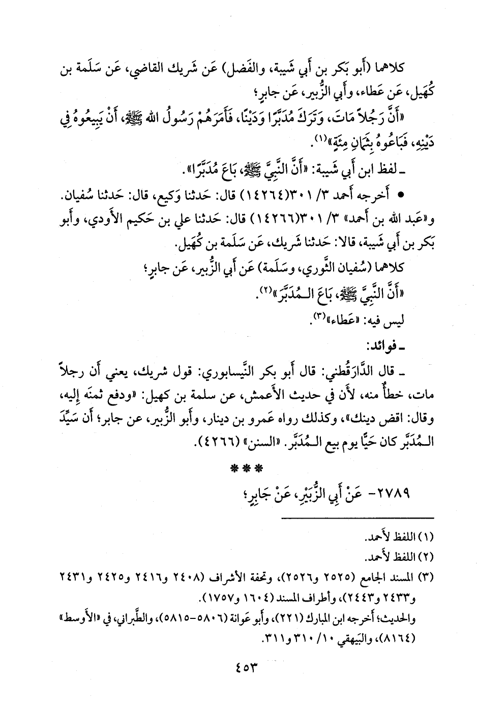 - قال الدارقُطني: قال أَبو بكر النيسابوري: قول شريك، يعني أن رجلا مات، خطأ منه، لأن في حديث الأعمش، عن سلمة بن كهيل: «ودفع ثمنه إليه، وقال: اقض دينك»، وكذلك رواه عَمرو بن دينار، وأَبو الزبير، عن جابر؛ أن سيد المدبر كان حيا يوم بيع المدبر. «السنن» (٤٢٦٦).