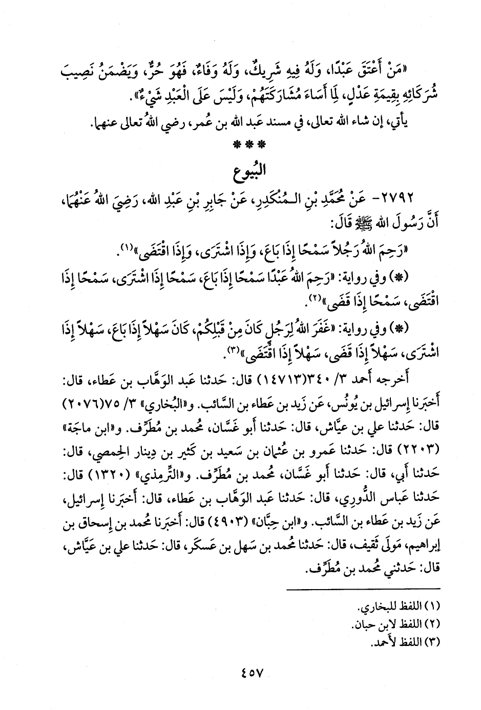 أخرجه أحمد (١٤٧١٣) قال: حدثنا عبد الوَهَّاب بن عطاء، قال: أخبرنا إسرائيل بن يونس، عن زيد بن عطاء بن السائب. و «البخاري» ٣/ ٥٧ (٢٠٧٦) قال: حدثنا علي بن عياش، قال: حدثنا أَبو غسان، محمد بن مطرف. و «ابن ماجة» (٢٢٠٣) قال: حدثنا عَمرو بن عثمان بن سعيد بن كثير بن دينار الحِمصي، قال: حدثنا أبي، قال: حدثنا أَبو غسان، محمد بن مطرف. و «التِّرمِذي» (١٣٢٠) قال: حدثنا عباس الدوري، قال: حدثنا عبد الوَهَّاب بن عطاء، قال: أخبرنا إسرائيل، عن زيد بن عطاء بن السائب. و «ابن حِبَّان» (٤٩٠٣) قال: أخبرنا محمد بن إسحاق بن إبراهيم مولى ثقيف، قال: حدثنا محمد بن سهل بن عسكر، قال: حدثنا علي بن عياش، قال: حدثني محمد بن مطرف.