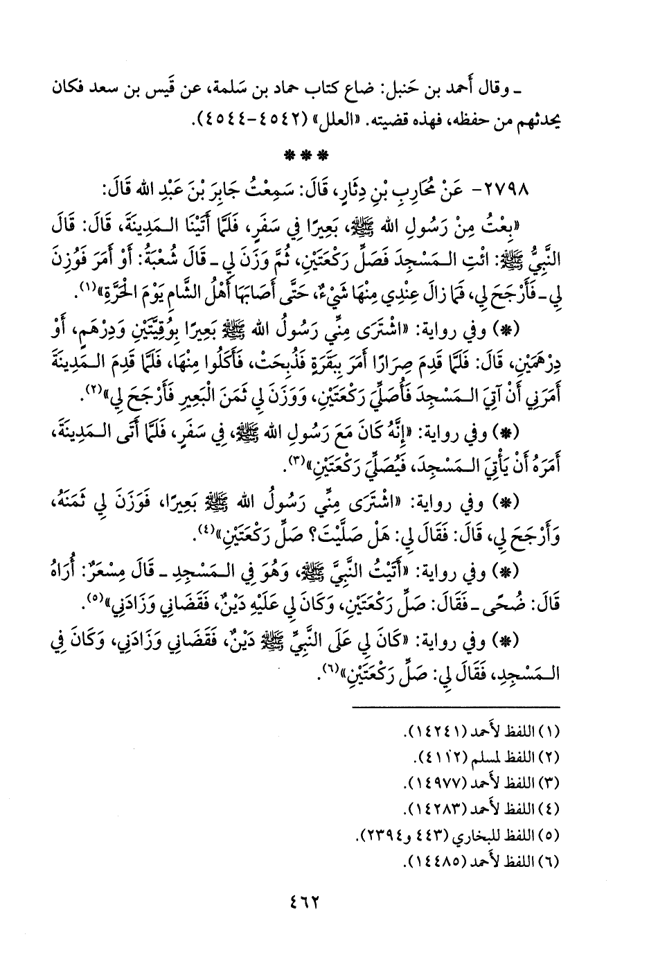 «بِعْتُ مِنْ رَسُولِ اللهِ صَلى الله عَليه وسَلم بَعِيرًا فِي سَفَرٍ، فَلَمَّا أَتَيْنَا المَدِينَةَ، قَالَ: قَالَ النَّبِيُّ صَلى الله عَليه وسَلم: ائْتِ المَسْجِدَ، فَصَلِّ رَكْعَتَيْنِ، ثُمَّ وَزَنَ لِي ـ قَالَ شُعْبَةُ: أَوْ أَمَرَ فَوُزِنَ لِي ـ فَأَرْجَحَ لِي، فَمَا زَالَ عِنْدِي مِنْهَا شَيْءٌ، حَتَّى أَصَابَهَا أَهْلُ الشَّامِ يَوْمَ الحَرَّةِ» (¬١).