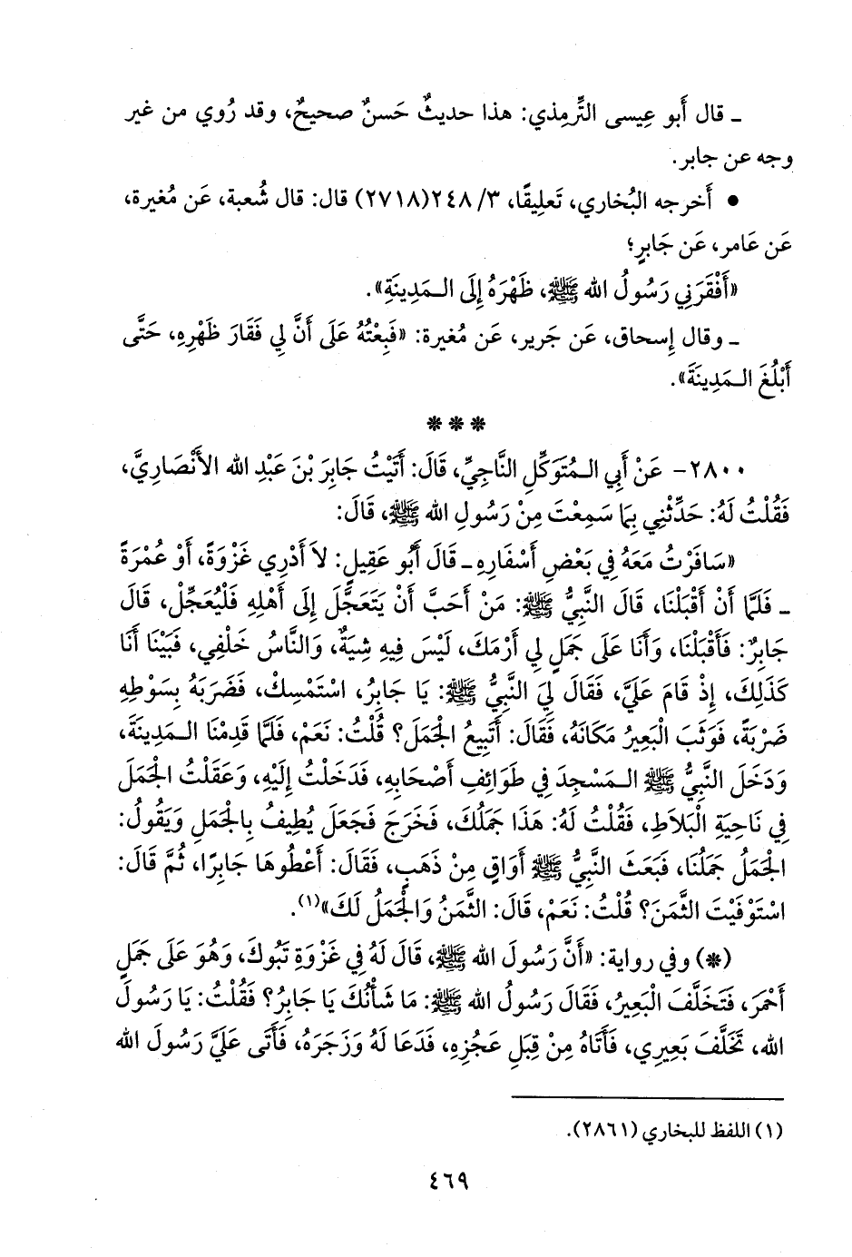 «سافرت معه في بعض أسفاره ـ قال أَبو عقيل: لا أدري غزوة، أو عمرة ـ فلما أن أقبلنا، قال النبي صَلى الله عَليه وسَلم: من أحب أن يتعجل إلى أهله فليعجل، قال جابر: فأقبلنا، وأنا على جمل لي أرمك، ليس فيه شية، والناس خلفي، فبينا أنا كذلك، إذ قام علي، فقال لي النبي صَلى الله عَليه وسَلم: يا جابر، استمسك، فضربه بسوطه ضربة، فوثب البعير مكانه، فقال: أتبيع الجمل؟ قلت: نعم، فلما قدمنا المدينة، ودخل النبي صَلى الله عَليه وسَلم المسجد في طوائف أصحابه، فدخلت إليه، وعقلت الجمل في ناحية البلاط، فقلت له: هذا جملك، فخرج فجعل يطيف بالجمل ويقول: الجمل جملنا، فبعث النبي صَلى الله عَليه وسَلم أواق من ذهب، فقال: أعطوها جابرا، ثم قال: استوفيت الثمن؟ قلت: نعم، قال: الثمن والجمل لك» (¬١).