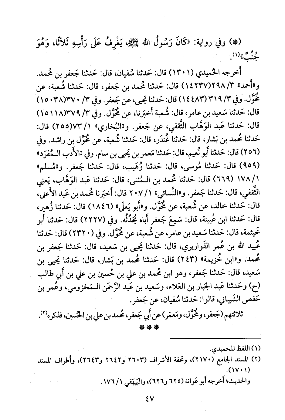 وفي ٣/ ٣٧٩ (١٥١١٨) قال: حدثنا عبد الوَهَّاب الثقفي، عن جعفر. و «البخاري» ١/ ٦٠ (٢٥٥) قال: حدثنا محمد بن بشار، قال: حدثنا غُندَر، قال: حدثنا شعبة، عن مخول بن راشد. وفي (٢٥٦) قال: حدثنا أَبو نُعيم، قال: حدثنا معمر بن يحيى بن سام. وفي «الأدب المفرد» (٩٥٩) قال: حدثنا موسى، قال: حدثنا وهيب، قال: حدثنا جعفر. و «مسلم» ١/ ١٧٨ (٦٦٩) قال: حدثنا محمد بن المثنى، قال: حدثنا عبد الوَهَّاب، يعني الثقفي، قال: حدثنا جعفر. و «النَّسَائي» ١/ ٢٠٧ قال: أخبرنا محمد بن عبد الأعلى، قال: حدثنا خالد، عن شعبة، عن مخول. و «أَبو يَعلى» (١٨٤٦) قال: حدثنا زهير، قال: حدثنا ابن عُيينة، قال: سمع جعفر أباه يحدثه. وفي (٢٢٢٧) قال: حدثنا أَبو خيثمة، قال: حدثنا سعيد بن عامر، عن شعبة، عن مخول. وفي (٢٣٢٠) قال: حدثنا عُبيد الله بن عمر القواريري، قال: حدثنا يحيى بن سعيد، قال: حدثنا جعفر بن محمد. و «ابن خزيمة» (٢٤٣) قال: حدثنا محمد بن بشار، قال: حدثنا يحيى بن سعيد، قال: حدثنا جعفر، وهو ابن محمد بن علي بن حسين بن علي بن أبي طالب (ح) وحدثنا عبد الجبار بن العلاء، وسعيد بن عبد الرَّحمَن المخزومي، وعمر بن حفص الشيباني، قالوا: حدثنا سفيان، عن جعفر.