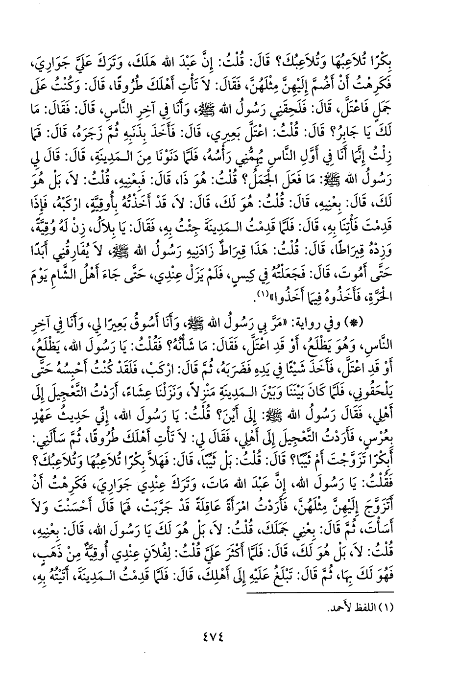 - وفي رواية: «مر بي رسول الله صَلى الله عَليه وسَلم وأنا أسوق بعيرا لي، وأنا في آخر الناس، وهو يظلع، أو قد اعتل، فقال: ما شأنه؟ فقلت: يا رسول الله، يظلع، أو قد اعتل، فأخذ شيئًا في يده فضربه، ثم قال: اركب، فلقد كنت أحبسه حتى يلحقوني، فلما كان بيننا وبين المدينة منزلا، ونزلنا عشاء، أردت التعجيل إلى أهلي، فقال رسول الله صَلى الله عَليه وسَلم: إلى أين؟ قلت: يا رسول الله، إني حديث عهد بعرس، فأردت التعجيل إلى أهلي، فقال لي: لا تأت أهلك طروقا، ثم سألني: أبكرا تزوجت أم ثيبا؟ قال: قلت: بل ثيبا، قال: فهلا بكرا تلاعبها وتلاعبك؟ فقلت: يا رسول الله، إن عبد الله مات، وترك عندي جواري، فكرهت أن أتزوج إليهن مثلهن، فأردت امرأة عاقلة قد جربت، فما قال أحسنت ولا أسأت، ثم قال: بعني جملك، قلت: لا، بل هو لك يا رسول الله، قال: بعنيه، قلت: لا، بل هو لك، قال: فلما أكثر علي قلت: لفلان عندي أوقية من ذهب، فهو لك بها، ثم قال: تبلغ عليه إلى أهلك، قال: فلما قدمت المدينة، أتيته به،