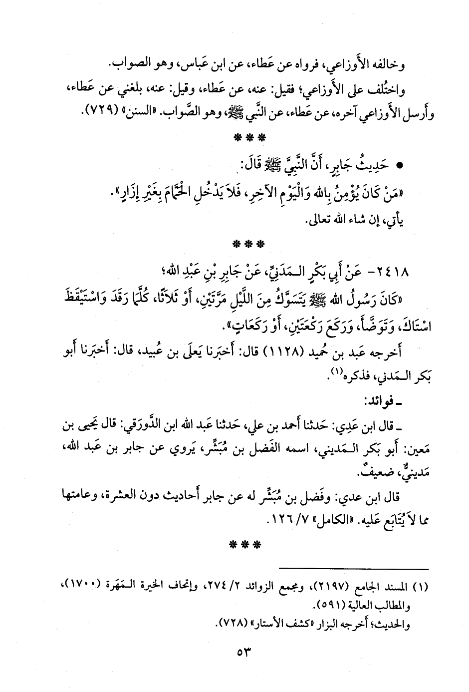 - قلنا: إِسناده ضعيفٌ؛ قال ابن عَدي: حدثنا أحمد بن علي، قال: حدثنا عبد الله بن الدورقي: قال يحيى بن مَعين: أَبو بكر المديني، اسمه الفضل بن مبشر، يروي عن جابر بن عبد الله، مديني، ضعيف.