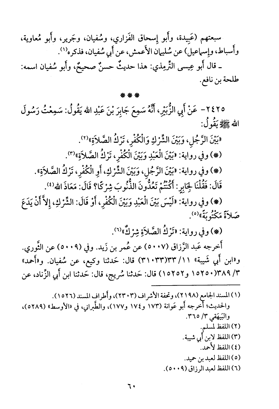 - وفي رواية: «بين الرجل، وبين الشرك، أو الكفر، ترك الصلاة».