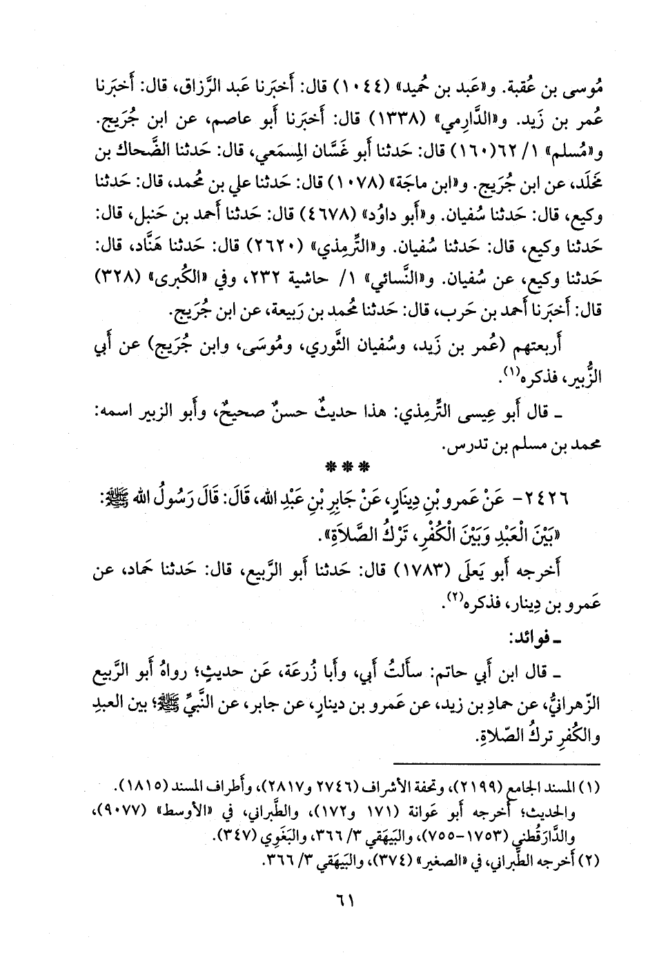 - قال عبد الرَّحمَن بن أبي حاتم الرازي: سألت أبي، وأَبا زُرعَة، عن حديث؛ رواه أَبو الربيع الزهراني، عن حماد بن زيد، عن عَمرو بن دينار، عن جابر، عن النبي صَلى الله عَليه وسَلم؛ بين العبد والكفر ترك الصلاة.