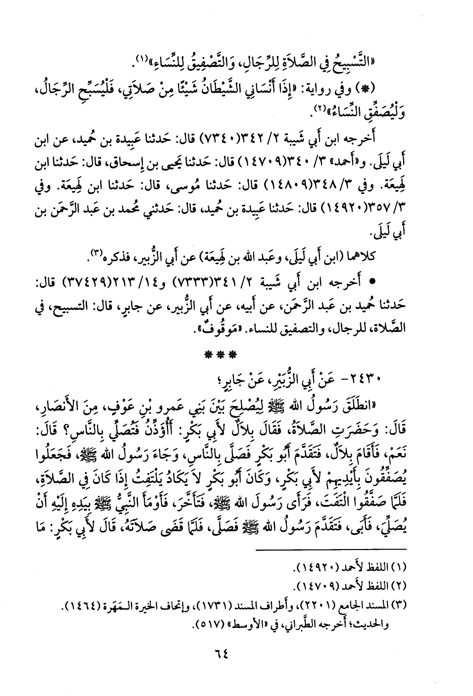 منعك أن تصلي؟ قال: ما كان لابن أبي قحافة أن يؤم رسول الله صَلى الله عَليه وسَلم فأقبل على القوم، فقال: ما بال التصفيق؟ إنما التصفيق في الصلاة للنساء، فإذا كانت لأحدكم حاجة فليسبح».