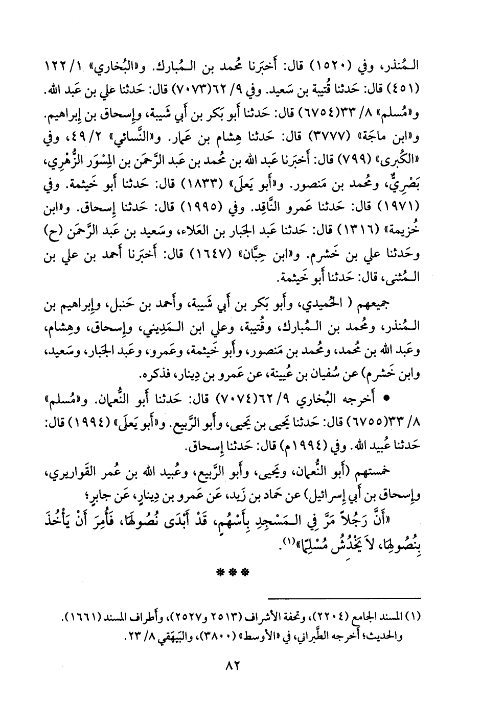 جميعهم (الحميدي، وأَبو بكر بن أبي شيبة، وأحمد بن حنبل، وإبراهيم بن المنذر، ومحمد بن المبارك، وقتيبة، وعلي بن المديني، وإسحاق، وهشام، وعبد الله بن محمد، ومحمد بن منصور، وأَبو خيثمة، وعَمرو، وعبد الجبار، وسعيد، وابن خَشرَم) عن سفيان بن عُيينة، عن عَمرو بن دينار، فذكره.