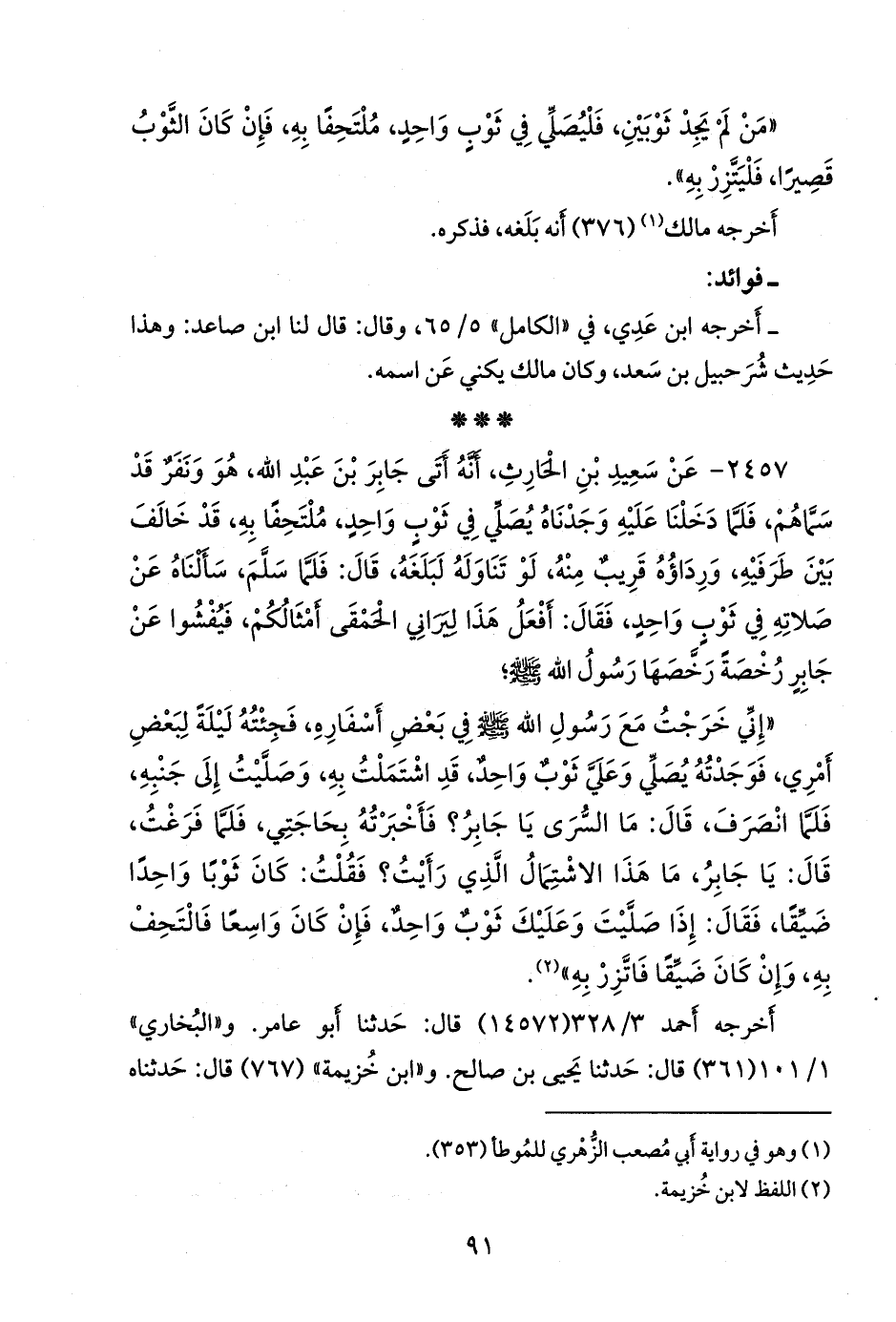 ٢٤٥٧ - عن سعيد بن الحارث، أنه أتى جابر بن عبد الله، هو ونفر قد سماهم، فلما دخلنا عليه وجدناه يصلي في ثوب واحد، ملتحفا به، قد خالف بين طرفيه، ورداؤه قريب منه، لو تناوله لبلغه، قال: فلما سلم، سألناه عن صلاته في ثوب واحد، فقال: أفعل هذا ليراني الحمقى أمثالكم، فيفشوا عن جابر رخصة رخصها رسول الله صَلى الله عَليه وسَلم؛