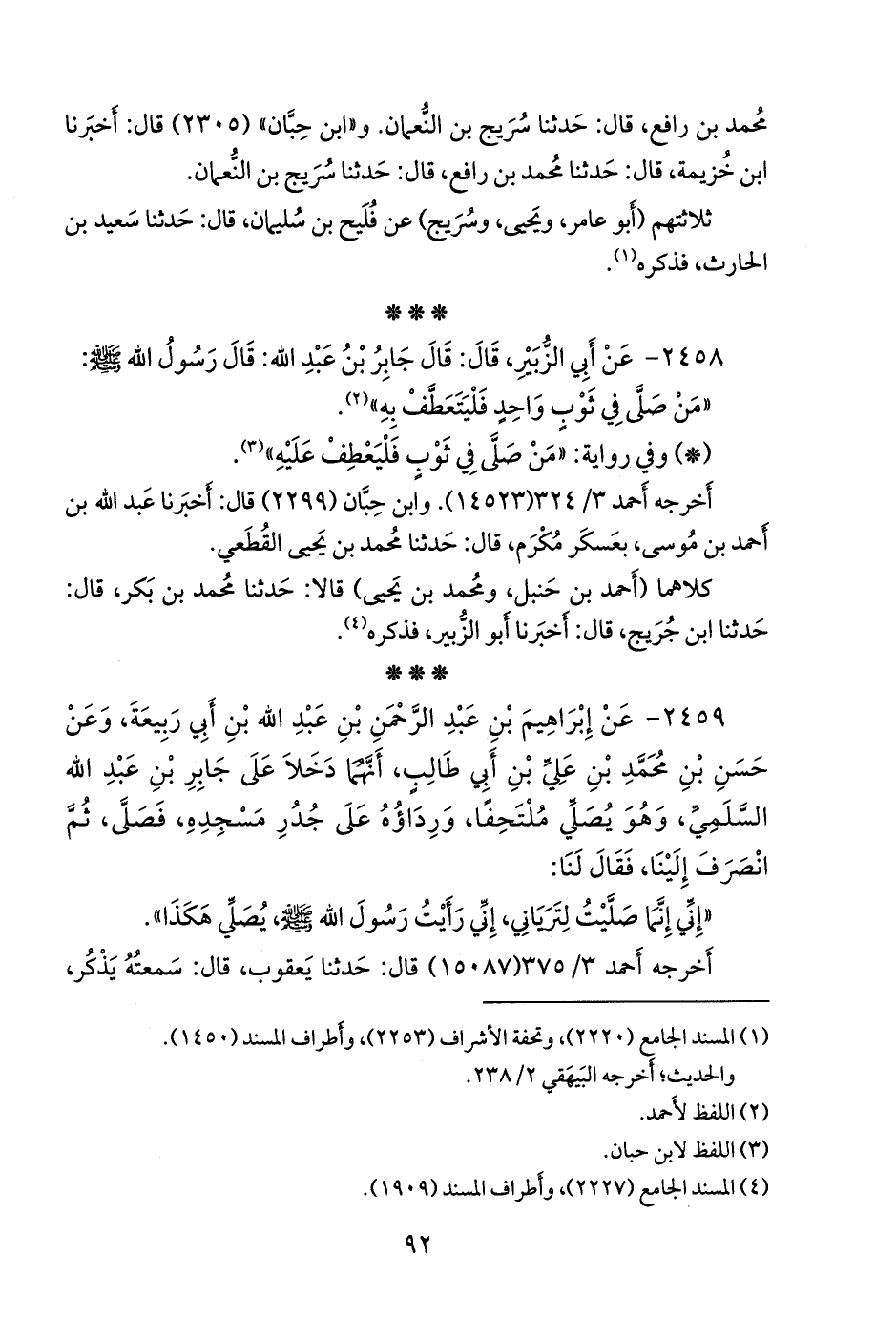 ٢٤٥٩ - عن إبراهيم بن عبد الرَّحمَن بن عبد الله بن أبي ربيعة، وعن حسن بن محمد بن علي بن أبي طالب، أنهما دخلا على جابر بن عبد الله السلمي، وهو يصلي ملتحفا، ورداؤه على جدر مسجده، فصلى، ثم انصرف إلينا، فقال لنا: