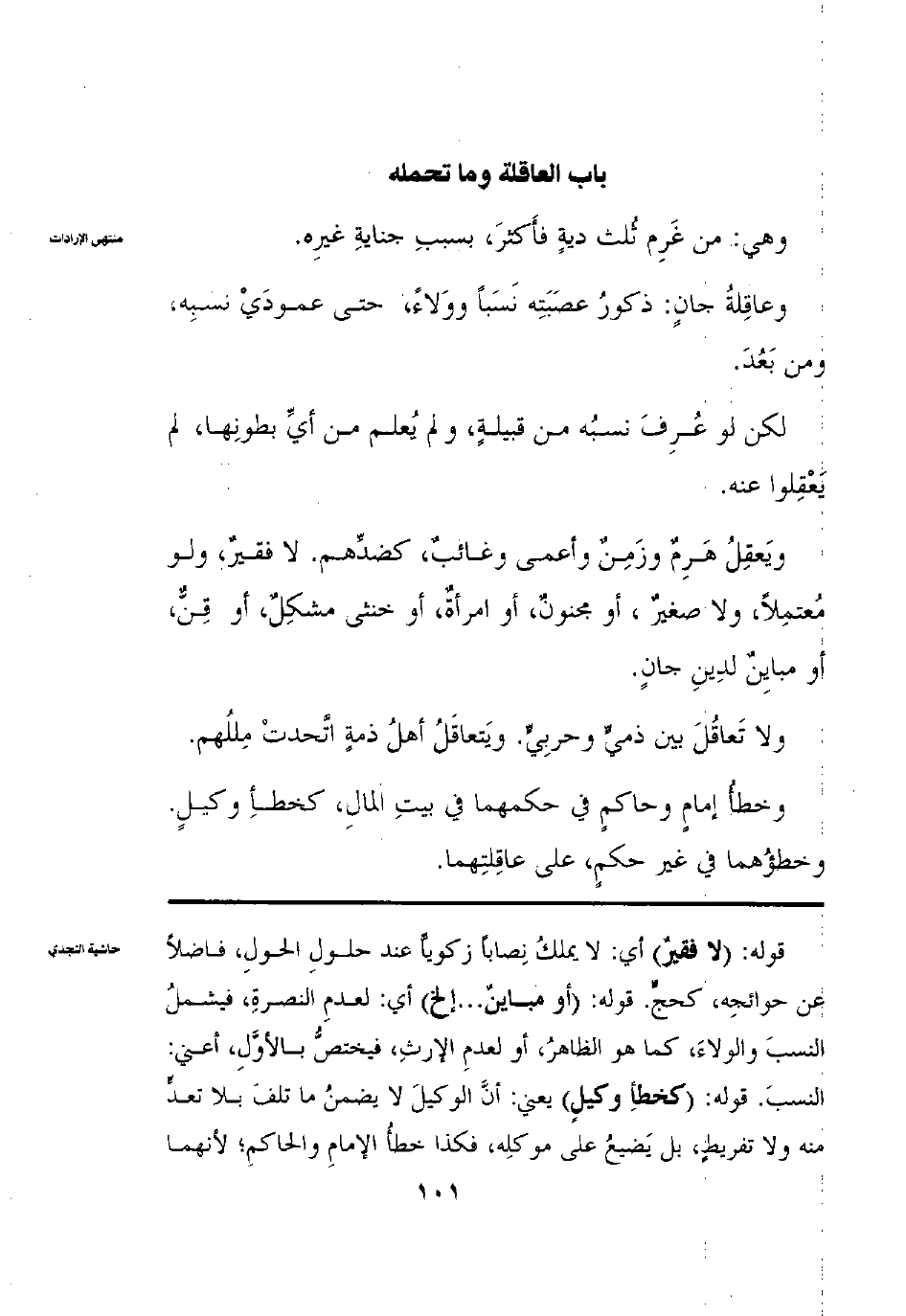 وَهِيَ: مَنْ غَرِمَ ثُلُثَ دِيَةٍ فَأَكْثَرَ بِسَبَبِ جِنَايَةِ غَيْرِهِ وَعَاقِلَةُ جَانٍ ذُكُورُ عَصَبَتِهِ نَسَبًا وَوَلَاءً حَتَّى عَمُودَيْ نَسَبِهِ ومَنْ بَعُدَ لَكِنْ لَوْ عَرَفَ نَسَبَهُ مِنْ قَبِيلَةٍ وَلَمْ يَعْلَمْ مِنْ أَيِّ بُطُونِهَا لَمْ يَعْقِلُوا عَنْهُ وَيَعْقِلُ هَرِمٍ وَزَمِنٍ وَأَعْمَى وَغَائِبٍ كَضِدِّهِمْ لَا فَقِيرٌ وَلَوْ مُعْتَمِلًا وَلَا صَغِيرٌ أَوْ مَجْنُونٌ أَوْ امْرَأَةٌ أَوْ خُنْثَى مُشْكِلٌ أَوْ قِنٌّ أَوْ مُبَايِنٌ لِدِينٍ جَانٍ وَلَا تَعَاقُلَ بَيْنَ ذِمِّيٍّ وَحَرْبِيٍّ وَيَتَعَاقَلُ أَهْلُ ذِمَّةٍ اتَّحَدَتْ مِلَلُهُمْ وَخَطَأُ إمَامٍ وحَاكِمٍ فِي حُكْمِهِمَا فِي بَيْتِ الْمَالِ كَخَطَأِ وَكِيلٍ وَخَطَؤُهُمَا فِي غَيْرِ حُكْمٍ عَلَى عَاقِلَتِهِمَا