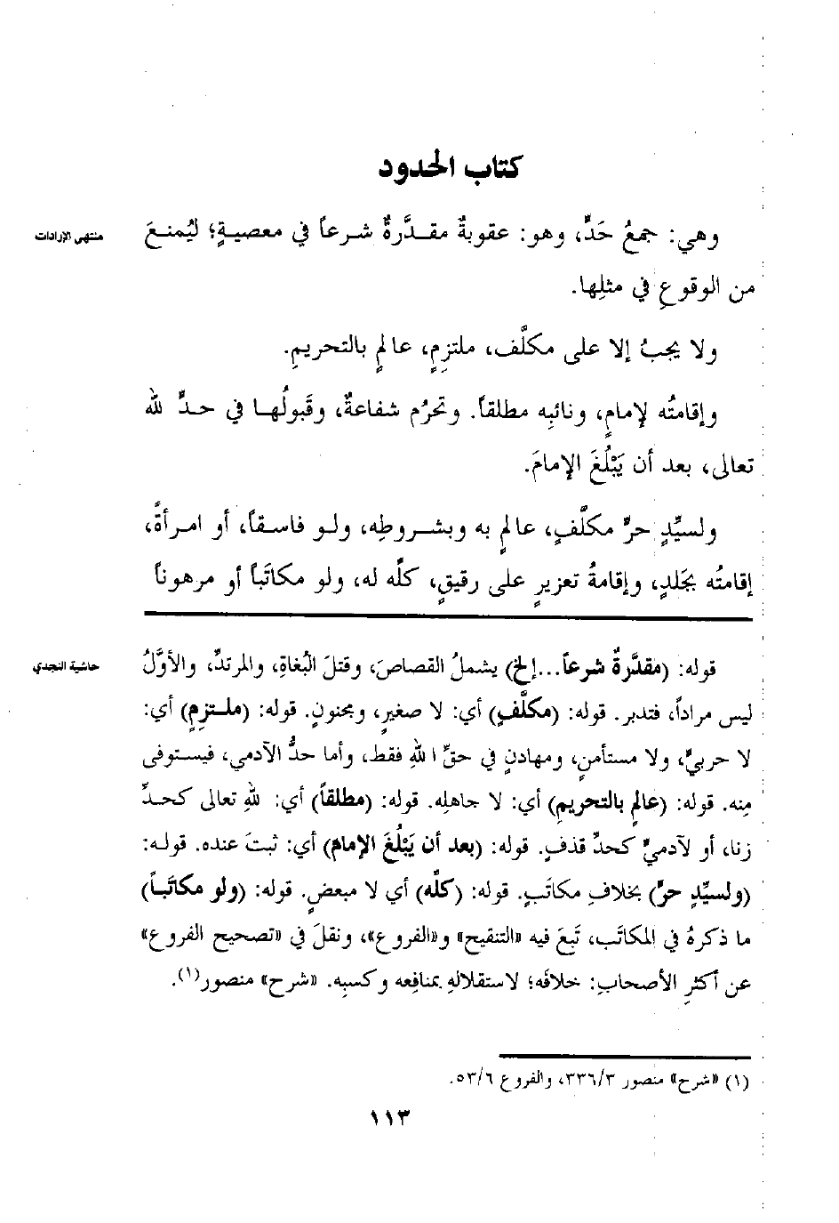 وَهِيَ: جَمْعُ حَدٍّ وَهُوَ عُقُوبَةٌ مُقَدَّرَةٌ شَرْعًا فِي مَعْصِيَةٍ لِتَمْنَعَ مِنْ الْوُقُوعِ فِي مِثْلِهَا وَلَا يَجِبُ مُلْتَزِمِ عَالِمٍ بِالتَّحْرِيمِ وَإِقَامَتُهُ لِلْإِمَامِ وَنَائِبِهِ مُطْلَقًا وَتَحْرُمُ شَفَاعَةٌ وقَبُولُهَا فِي حَدِّ اللَّهِ تَعَالَى بَعْدَ أَنْ يَبْلُغَ الْإِمَامَ وَلِسَيِّدٍ حُرٍّ مُكَلَّفٍ عَالِمٍ بِهِ وَبِشُرُوطِهِ وَلَوْ فَاسِقًا أَوْ امْرَأَةً إقَامَتُهُ بِجَلْدٍ، وَإِقَامَةُ تَعْزِيرٍ عَلَى رَقِيقٍ كُلِّهِ لَهُ وَلَوْ مُكَاتَبًا أَوْ مَرْهُونًا