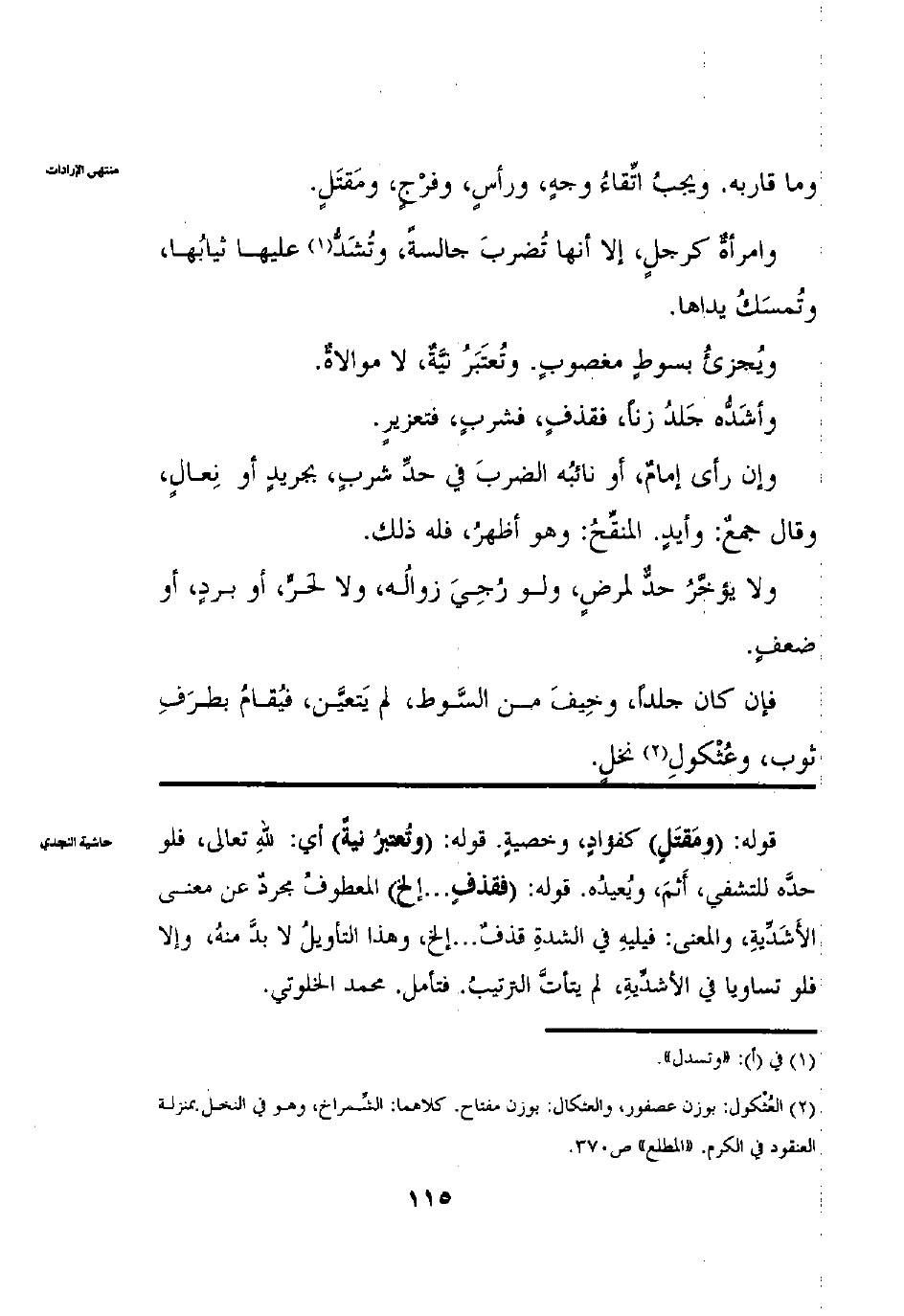 وَمَا قَارَبَهُ وَيَجِبُ اتِّقَاءُ وَجْهٍ وفَرْجٍ ومَقْتَلٍ وَامْرَأَةٌ كَرَجُلٍ. إلَّا أَنَّهَا تُضْرَبُ جَالِسَةً وَتُشَدُّ عَلَيْهَا ثِيَابُهَا، وَتُمْسَكُ يَدَاهَا وَيُجْزِئُ بِسَوْطٍ مَغْصُوبٍ وَتُعْتَبَرُ نِيَّةٌ لَا مُوَالَاةُ وَأَشَدُّهُ جَلْدُ زِنًا فقَذْفٍ فشُرْبِ فتَعْزِيرٍ وَإِنْ رَأَى إمَامٌ أَوْ نَائِبُهُ الضَّرْبَ فِي حَدِّ شُرْبِ بِجَرِيدٍ أَوْ نِعَالٍ وَقَالَ جَمْعٌ وَبِأَيْدٍ الْمُنَقِّحُ وَهُوَ أَظْهَرُ فَلَهُ ذَلِكَ وَلَا يُؤَخَّرُ اسْتِيفَاءُ حَدٍّ لِمَرَضٍ وَلَوْ رَجَى زَوَالُهُ وَلَا الْحَرُّ أَوْ بَرْدٌ أَوْ ضَعْفٌ فَإِنْ كَانَ جَلْدًا وَخِيفَ مِنْ السَّوْطِ لَمْ يَتَعَيَّنْ فَيُقَامُ بِطَرَفِ ثَوْبٍ وَعُثْكُولِ نَخْلٍ