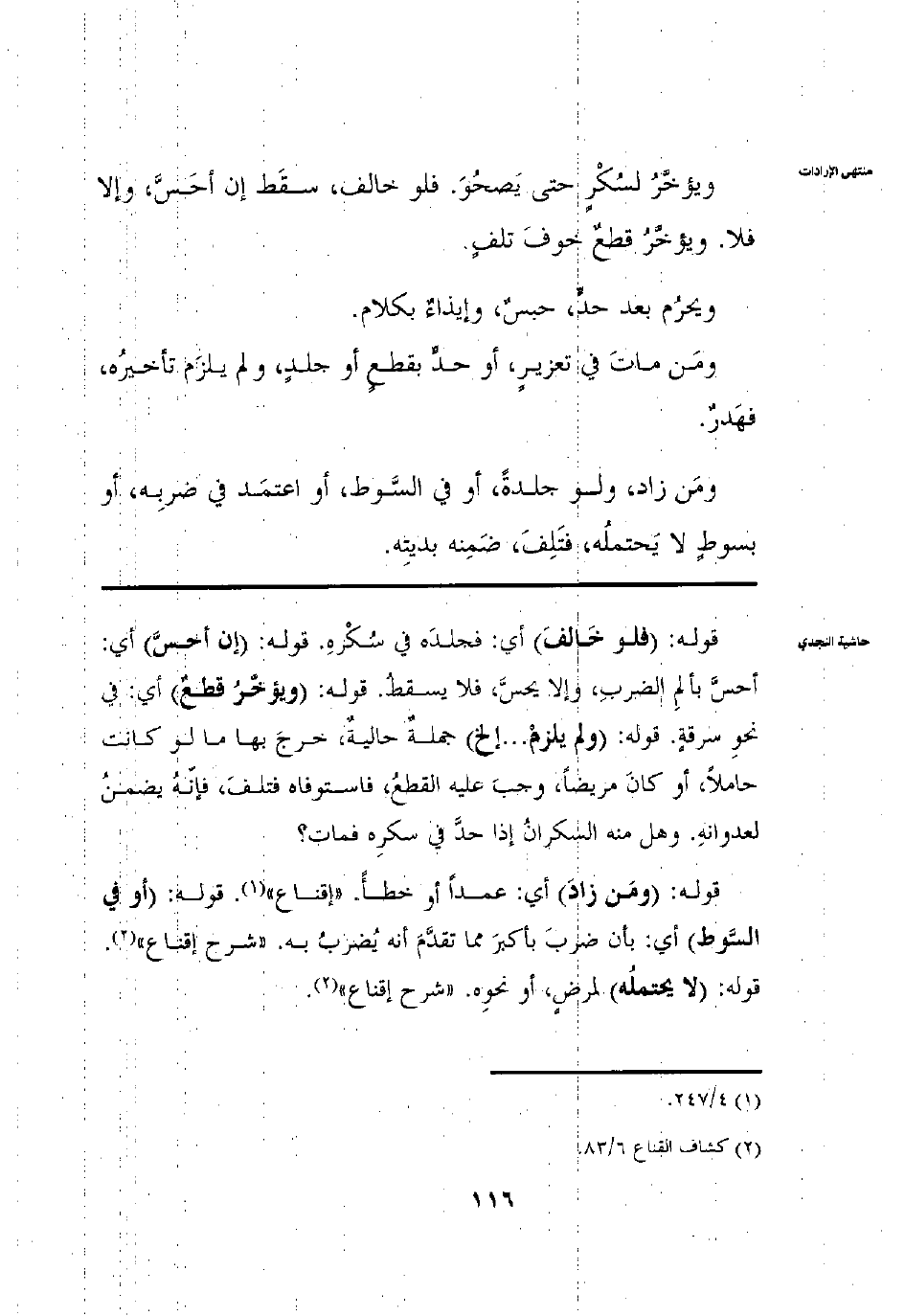 وَيُؤَخَّرُ لِسُكْرٍ حَتَّى يَصْحُوَ فَلَوْ خَالَفَ سَقَطَ إنْ أَحَسَّ وَإِلَّا فَلَا وَيُؤَخَّرُ قَطْعٌ خَوْفَ تَلَفِ وَيَحْرُمُ بَعْدَ حَدٍّ حَبْسُ وَإِيذَاؤُهُ بِكَلَامٍ وَمَنْ مَاتَ فِي تَعْزِيرٍ أَوْ حَدٍّ بِقَطْعٍ أَوْ جَلْدٍ وَلَمْ يَلْزَمْهُ تَأْخِيرُهُ فهَدَرٌ وَمَنْ زَادَ وَلَوْ جَلْدَةً أَوْ فِي السَّوْطِ أَوْ اعْتَمَدَ فِي ضَرْبِهِ أَوْ بِسَوْطٍ لَا يَحْتَمِلُهُ فَتَلِفَ ضَمِنَهُ بِدِيَتِهِ