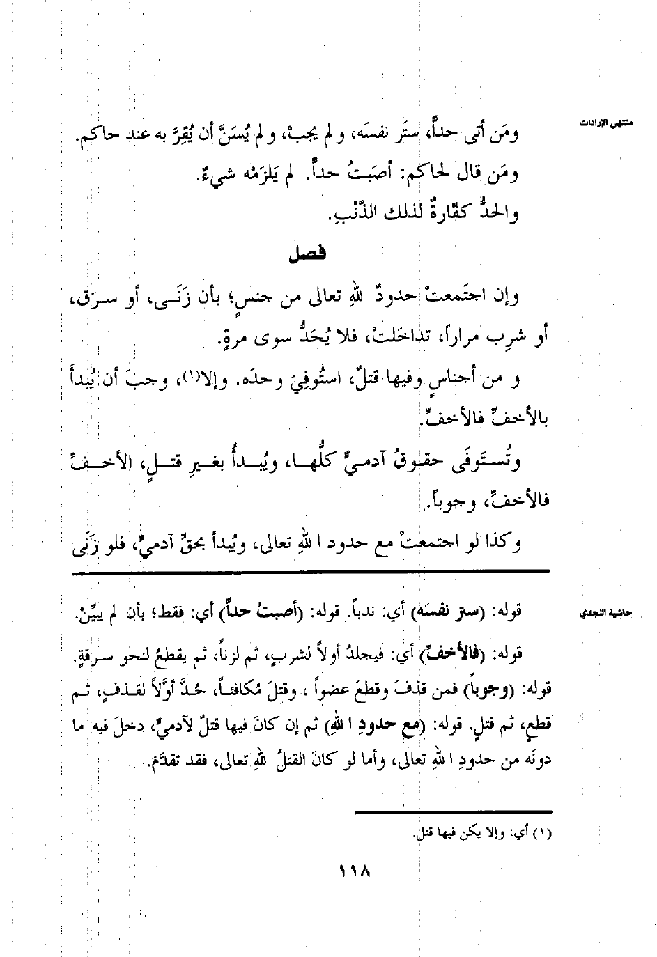 وإن اجتمعت حدود الله تعالى من جنس بِأَنْ زَنَى أَوْ سَرَقَ أَوْ شَرِبَ الْخَمْرَ مِرَارًا تَدَاخَلَتْ فَلَا يُحَدُّ سِوَى مَرَّةٍ ومِنْ أَجْنَاسٍ وَفِيهَا قَتْلٌ اسْتَوْفَى وَحْدَهُ وَإِلَّا وَجَبَ أَنْ يُبْدَأَ بِالْأَخَفِّ فَالْأَخَفِّ وَتُسْتَوْفَى حُقُوقُ آدَمِيٍّ كُلُّهَا وَيُبْدَأُ بِغَيْرِ قَتْلٍ الْأَخَفُّ فَالْأَخَفُّ وُجُوبًا وَكَذَا لَوْ اجْتَمَعَتْ مَعَ حُدُودِ اللَّهِ تَعَالَى وَيُبْدَأُ بِحَقِّ آدَمِيٍّ فَلَوْ زَنَى