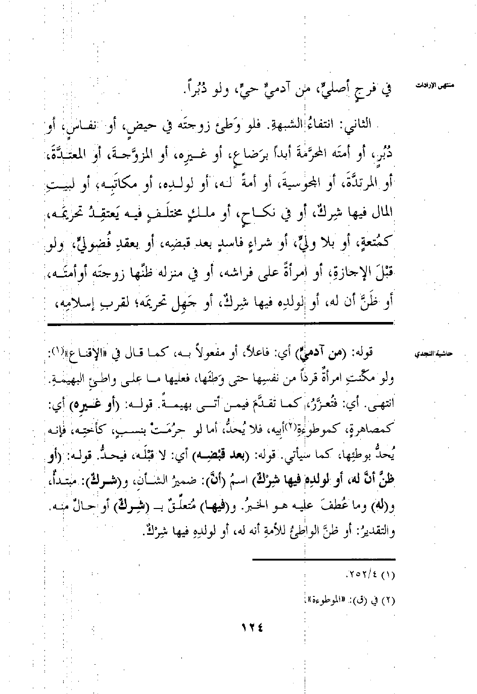 فِي فَرْجٍ أَصْلِيٍّ مِنْ آدَمِيٍّ حَيٍّ وَلَوْ دُبُرًا الثَّانِي انْتِفَاءُ الشُّبْهَةِ فَلَوْ وَطِئَ زَوْجَتَهُ فِي حَيْضٍ أَوْ نِفَاسٍ أَوْ دُبُرِ أَوْ أَمَتَهُ الْمُحَرَّمَةَ بِرَضَاعٍ أَوْ غَيْرِهِ أَوْ الْمُزَوَّجَةَ أَوْ الْمُعْتَدَّةَ أَوْ الْمُرْتَدَّةَ أَوْ الْمَجُوسِيَّةَ أَوْ أَمَةً لَهُ أَوْ لِوَلَدِهِ أَوْ لِمُكَاتَبِهِ أَوْ لِبَيْتِ الْمَالِ فِيهَا شِرْكٌ أَوْ فِي نِكَاحٍ أَوْ مِلْكٍ مُخْتَلَفٍ فِيهِ يَعْتَقِدُ تَحْرِيمَهُ كَمُتْعَةٍ أَوْ بِلَا وَلِيٍّ أَوْ شِرَاءٍ فَاسِدٍ بَعْدَ قَبْضِهِ أَوْ بِعَقْدِ فُضُولِيٍّ وَلَوْ قَبْلَ الْإِجَازَةِ أَوْ امْرَأَةً عَلَى فِرَاشِهِ أَوْ فِي مَنْزِلِهِ ظَنَّهَا زَوْجَتَهُ أَوْ أَمَتَهُ أَوْ ظَنَّ أَنَّهُ أَوْ لِوَلَدِهِ فِيهَا شِرْكٌ أَوْ جَهِلَ تَحْرِيمَهُ لِقُرْبِ إسْلَامِهِ