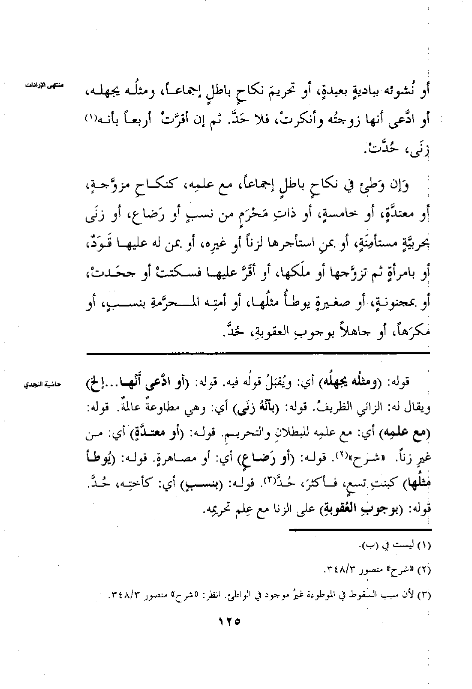 أَوْ نُشوئه بِبَادِيَةٍ بَعِيدَةٍ أَوْ تَحْرِيمَ نِكَاحٍ بَاطِلٍ إجْمَاعًا وَمِثْلُهُ يَجْهَلُهُ أَوْ ادَّعَى أَنَّهَا زَوْجَتُهُ وَأَنْكَرَتْ فَلَا حَدَّ ثُمَّ إنْ أَقَرَّتْ أَرْبَعًا بِأَنَّهُ زَنَى حُدَّتْ وَإِنْ وَطِئَ فِي نِكَاحٍ بَاطِلٍ إجْمَاعًا مَعَ عِلْمِهِ كَنِكَاحِ مُزَوَّجَةٍ أَوْ مُعْتَدَّةٍ أَوْ خَامِسَةٍ أَوْ ذَاتِ مَحْرَمٍ مِنْ نَسَبٍ أَوْ رَضَاعٍ أَوْ زَنَى بِحَرْبِيَّةٍ مُسْتَأْمَنَةٍ أَوْ بِمَنْ اسْتَأْجَرَهَا لِزِنًا أَوْ غَيْرِهِ أَوْ بِمَنْ لَهُ عَلَيْهَا قَوَدٌ أَوْ بِامْرَأَةٍ ثُمَّ تَزَوَّجَهَا أَوْ مَلَكَهَا أَوْ أَقَرَّ عَلَيْهَا فَسَكَتَتْ أَوْ جَحَدَتْ أَوْ بِمَجْنُونَةٍ أَوْ صَغِيرَةٍ يُوطَأُ مِثْلُهَا أَوْ أَمَتَهُ الْمُحَرَّمَةَ بِنَسَبٍ أَوْ مُكْرَهًا أَوْ جَاهِلًا بِوُجُوبِ الْعُقُوبَةِ حُدَّ