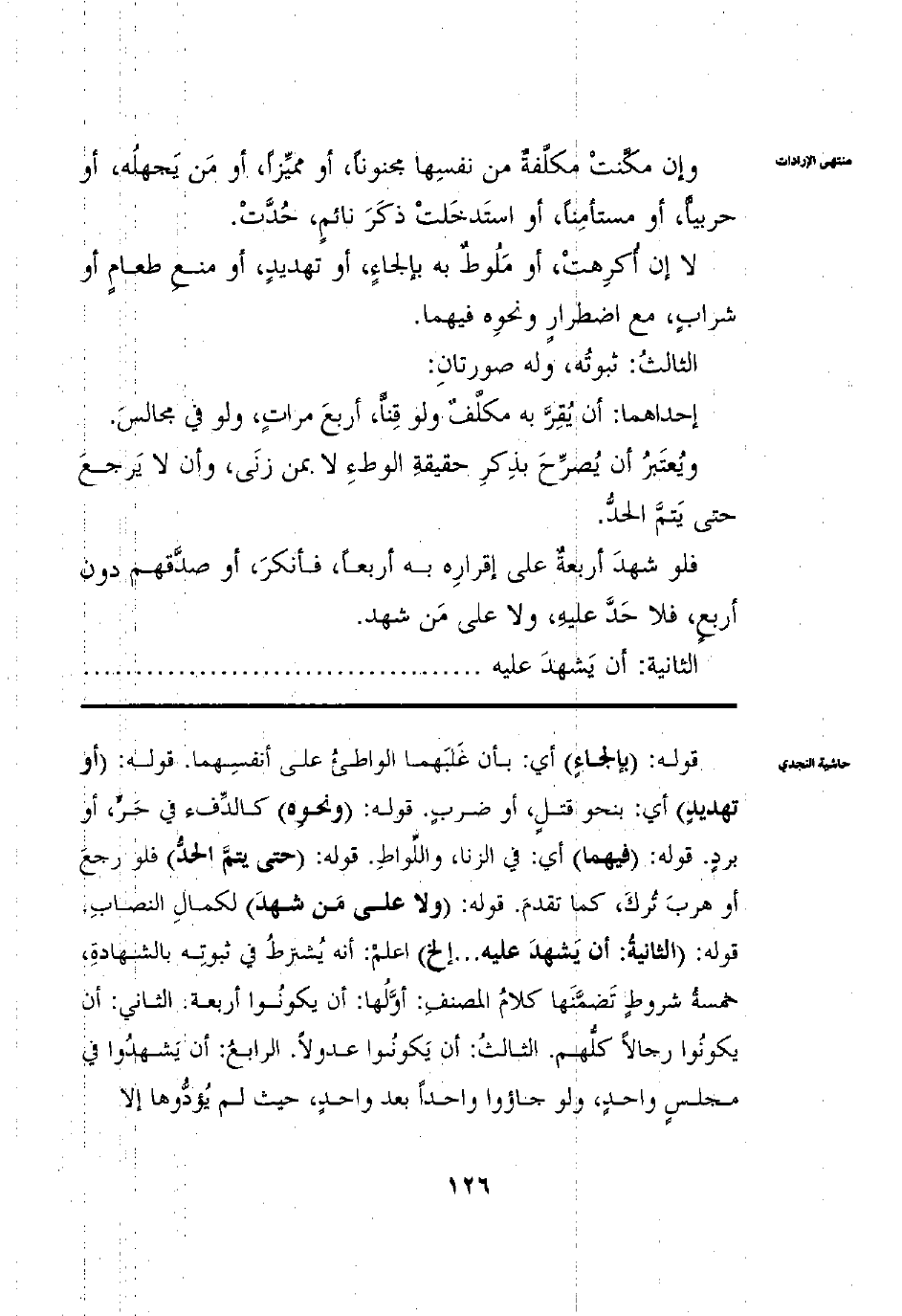 وَإِنْ مَكَّنَتْ مُكَلَّفَةٌ مِنْ نَفْسِهَا مَجْنُونًا أَوْ مُمَيِّزًا أَوْ مَنْ يَجْهَلُهُ أَوْ حَرْبِيًّا أَوْ مُسْتَأْمَنًا أَوْ اسْتَدْخَلَتْ ذَكَرَ نَائِمٍ حُدَّتْ لَا إنْ أُكْرِهَتْ أَوْ مَلُوطٌ بِهِ بِإِلْجَاءٍ أَوْ تَهْدِيدِ أَوْ مَنْعِ طَعَامٍ أَوْ شَرَابٍ مَعَ اضْطِرَارٍ وَنَحْوِهِ فِيهِمَا الثَّالِثُ ثُبُوتُهُ وَلَهُ صُورَتَانِ إحْدَاهُمَا أَنْ يُقِرَّ بِهِ مُكَلَّفٌ وَلَوْ قِنًّا أَرْبَعَ مَرَّاتٍ حَتَّى وَلَوْ فِي مَجَالِسَ وَيُعْتَبَرُ أَنْ يُصَرِّحَ بِذِكْرِ حَقِيقَةِ الْوَطْءِ وَلَا بِمَزْنِيٍّ بِهَا وأَنْ لَا يَرْجِعَ حَتَّى يَتِمَّ الْحَدُّ وَلَوْ شَهِدَ أَرْبَعَةٌ عَلَى إقْرَارِهِ بِهِ أَرْبَعًا فَأَنْكَرَ أَوْ صَدَّقَهُمْ دُونَ أَرْبَعِ فَلَا حَدَّ عَلَيْهِ وَلَا عَلَى مَنْ شَهِدَ الثَّانِيَةُ أَنْ يَشْهَدَ عَلَيْهِ