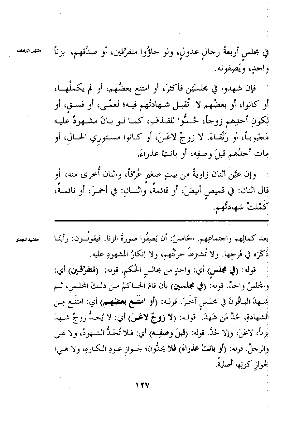 فِي مَجْلِسٍ أَرْبَعَةُ رِجَالٍ عُدُولٍ وَلَوْ جَاءُوا مُتَفَرِّقِينَ أَوْ صَدَّقَهُمْ بِزِنًا وَاحِدٍ وَيَصِفُونَهُ فَإِنْ شَهِدُوا فِي مَجْلِسَيْنِ فَأَكْثَرَ أَوْ امْتَنَعَ بَعْضُهُمْ أَوْ لَمْ يُكْمِلْهَا أَوْ كَانُوا أَوْ بَعْضُهُمْ لَا تُقْبَلُ شَهَادَتُهُمْ فِيهِ لِعَمًى أَوْ فِسْقٍ أَوْ لِكَوْنِ أَحَدِهِمْ زَوْجًا حُدُّوا لِلْقَذْفِ كَمَا لَوْ بَانَ مَشْهُودٌ عَلَيْهِ مَجْبُوبًا أَوْ رَتْقَاءَ لَا زَوْجٌ لَاعَنَ أَوْ كَانُوا مَسْتُورِي الْحَالِ أَوْ مَاتَ أَحَدُهُمْ قَبْلَ وَصْفِهِ أَوْ بَانَتْ عَذْرَاءَ وَإِنْ عَيَّنَ اثْنَانِ زَاوِيَةً مِنْ بَيْتٍ صَغِيرٍ عُرْفًا واثْنَانِ أُخْرَى مِنْهُ أَوْ قَالَ اثْنَانِ فِي قَمِيصٍ أَبْيَضَ أَوْ قَائِمَةً واثْنَانِ فِي أَحْمَرَ أَوْ نَائِمَةً كَمُلَتْ شَهَادَتُهُمْ