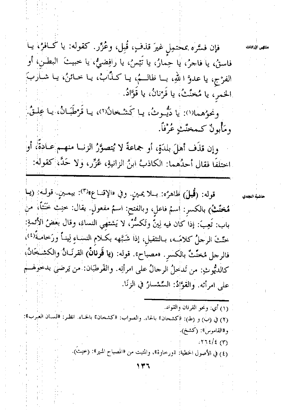 فَإِنْ فَسَّرَهُ بِمُحْتَمَلٍ غَيْرِ قَذْفٍ قُبِلَ وَعُزِّرَ قَوْلِهِ: يَا كَافِرُ يَا فَاسِقُ يَا فَاجِرُ يَا حِمَارُ يَا تَيْسُ يَا رَافِضِيُّ يَا خَبِيثَ الْبَطْنِ أَوْ الْفَرْجِ يَا عَدُوَّ اللَّهِ يَا ظَالِمُ يَا كَذَّابُ يَا خَائِنُ يَا شَارِبَ الْخَمْرِ يَا مُخَنَّثُ يَا قَرْنَانُ يَا قَوَّادُ وَنَحْوُهُمَا يَا دَيُّوثُ يَا كَشْخَانُ يَا قْرْطُبَانُ يَا عِلْقُ ومَأْبُونٍ كَمُخَنَّثٍ عُرْفًا وَإِنْ قَذَفَ أَهْلَ بَلَدٍ جَمَاعَةً لَا يُتَصَوَّرُ الزِّنَا مِنْهُمْ عَادَةً أَوْ اخْتَلَفَا فَقَالَ أَحَدُهُمَا: الْكَاذِبُ ابْنُ الزَّانِيَةِ عُزِّرَ وَلَا حَدَّ كَقَوْلِهِ: