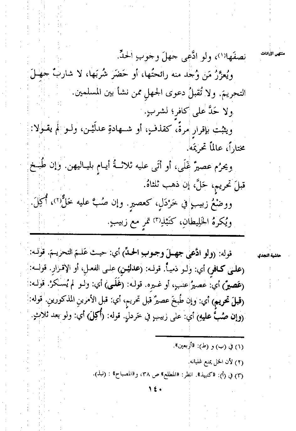 نِصْفُهَا وَلَوْ ادَّعَى جَهْلَ وُجُوبِ الْحَدِّ وَيُعَزَّرُ مَنْ وُجِدَ مِنْهُ رَائِحَتُهَا أَوْ حَضَرَ شُرْبَهَا لَا شَارِبُ جَهِلَ التَّحْرِيمَ وَلَا تُقْبَلُ دَعْوَى الْجَهْلِ مِمَّنْ نَشَأَ بَيْنَ الْمُسْلِمِينَ وَلَا حَدَّ عَلَى كَافِرٍ لِشُرْبِ وَيَثْبُتُ بِإِقْرَارٍ مَرَّةً كَقَذْفٍ أَوْ شَهَادَةِ عَدْلَيْنِ وَلَوْ لَمْ يَقُولَا مُخْتَارًا عَالِمًا تَحْرِيمِهِ وَيَحْرُمُ عَصِيرُ غَلَى أَوْ أَتَى عَلَيْهِ ثَلَاثَةُ أَيَّامٍ بِلَيَالِيِهِنَّ وَإِنْ طُبِخَ قَبْلَ تَحْرِيمٍ حَلَّ إنْ ذَهَبَ ثُلُثَاهُ وَوَضْعُ زَبِيبٍ فِي خَرْدَلٍ كَعَصِيرٍ وَإِنْ صُبَّ عَلَيْهِ خَلٌّ أُكِلَ وَيُكْرَهُ الْخَلِيطَانِ كَنَبِيذِ تَمْرٍ مَعَ زَبِيبٍ