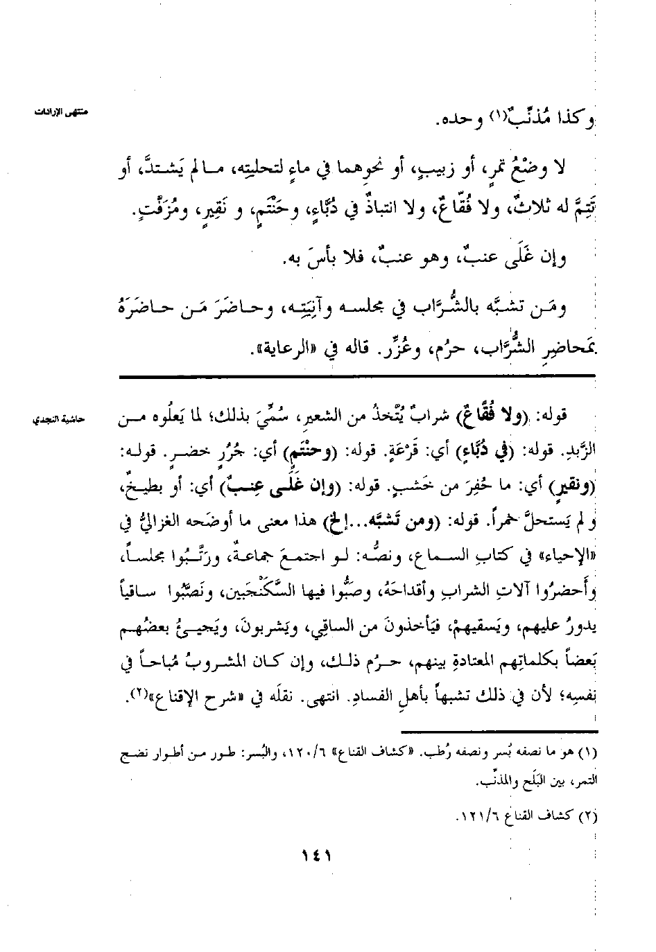 وَكَذَا مُذَنِّبٌ وَحْدَهُ لَا وَضْعُ تَمْرٍ أَوْ زَبِيبٍ أَوْ نَحْوَهُمَا فِي مَاءٍ لِتَحْلِيَتِهِ مَا لَمْ يَشْتَدَّ أَوْ تَتِمَّ لَهُ ثَلَاثُ وَلَا فُقَاعٌ وَلَا انْتِبَاذٌ فِي دُبَّاءَ وحَنْتَمٍ ومُقَيَّرٍ ومُزَفَّتٍ وَإِنْ غَلَى عِنَبٌ وَهُوَ عِنَبٌ فَلَا بَأْسَ بِهِ وَمَنْ تَشَبَّهَ بِالشُّرَّابِ فِي مَجْلِسِهِ وَآنِيَتِهِ، وَحَاضَرَ مَنْ حَاضَرَهُ بِمَجَالِسِ الشُّرَّابِ، حَرُمَ وَعُزِّرَ قَالَهُ فِي الرِّعَايَةِ