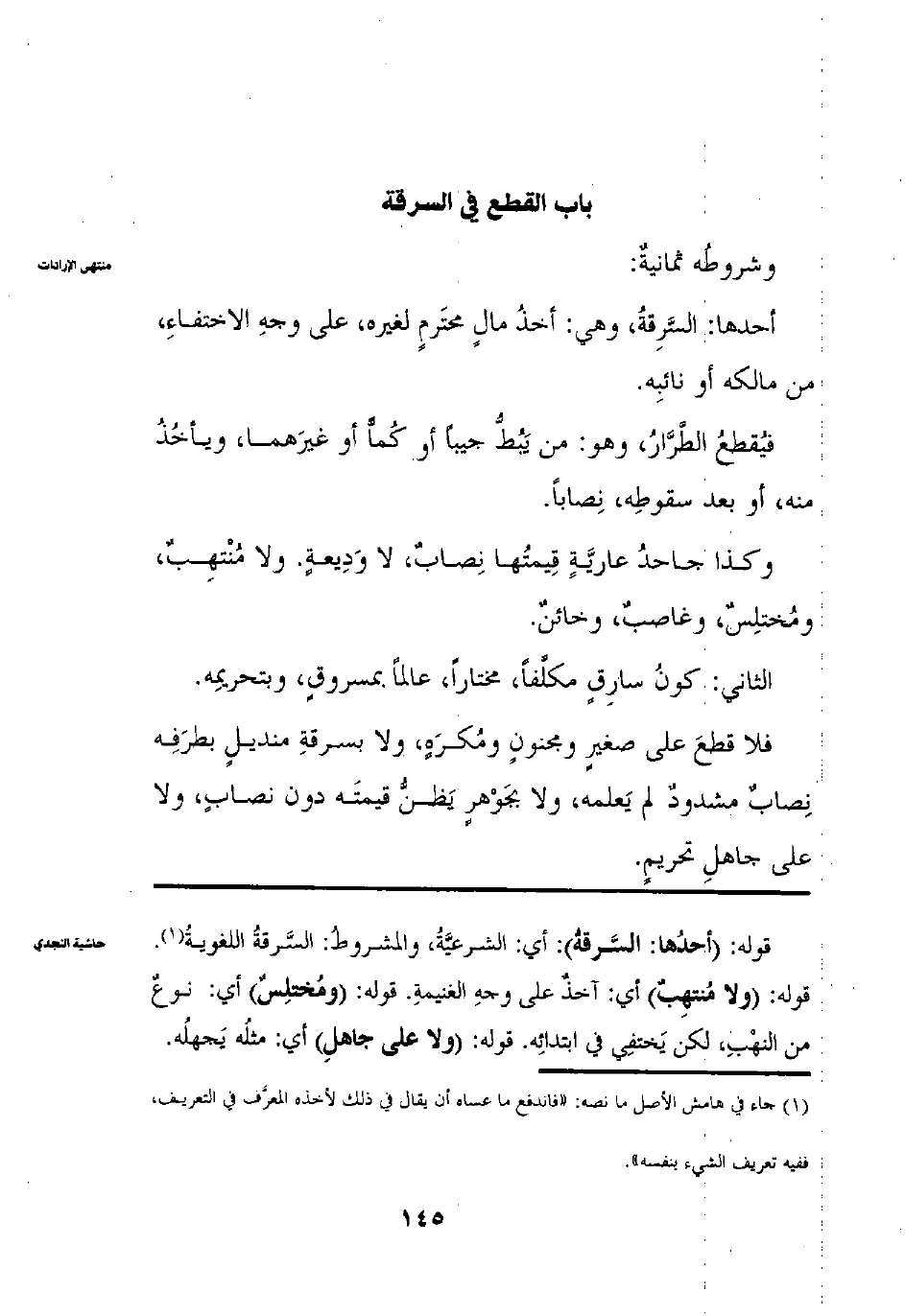 أَحَدُهَا: السَّرِقَةُ وَهِيَ أَخَذُ مَالٍ مُحْتَرَمٍ لِغَيْرِهِ عَلَى وَجْهِ الِاخْتِفَاءِ مِنْ مَالِكِهِ أَوْ نَائِبِهِ فَيُقْطَعُ الطَّرَّارُ وَهُوَ مَنْ بَطَّ جَيْبًا أَوْ كُمًّا أَوْ غَيْرَهُمَا وَيَأْخُذُ مِنْهُ أَوْ بَعْدَ سُقُوطِهِ نِصَابًا وَكَذَا جَاحِدُ عَارِيَّةٍ قِيمَتُهَا نِصَابٌ لَا وَدِيعَةٍ وَلَا مُنْتَهِبٌ ومُخْتَلِسٌ وغَاصِبٌ وخَائِنٌ الثَّانِي كَوْنُ سَارِقٍ مُكَلَّفًا مُخْتَارًا عَالِمًا بِمَسْرُوقٍ وَبِتَحْرِيمِهِ عَلَيْهِ فَلَا قَطْعَ عَلَى صَغِيرٍ وَمَجْنُونٍ وَمُكْرَهٍ وَلَا بِسَرِقَةِ مِنْدِيلٍ بِطَرَفِهِ نِصَابٌ مَشْدُودٌ لَمْ يَعْلَمْهُ وَلَا بجَوْهَرٍ يَظُنُّ قِيمَتَهُ دُونَ نِصَابٍ وَلَا عَلَى جَاهِلِ تَحْرِيمِ