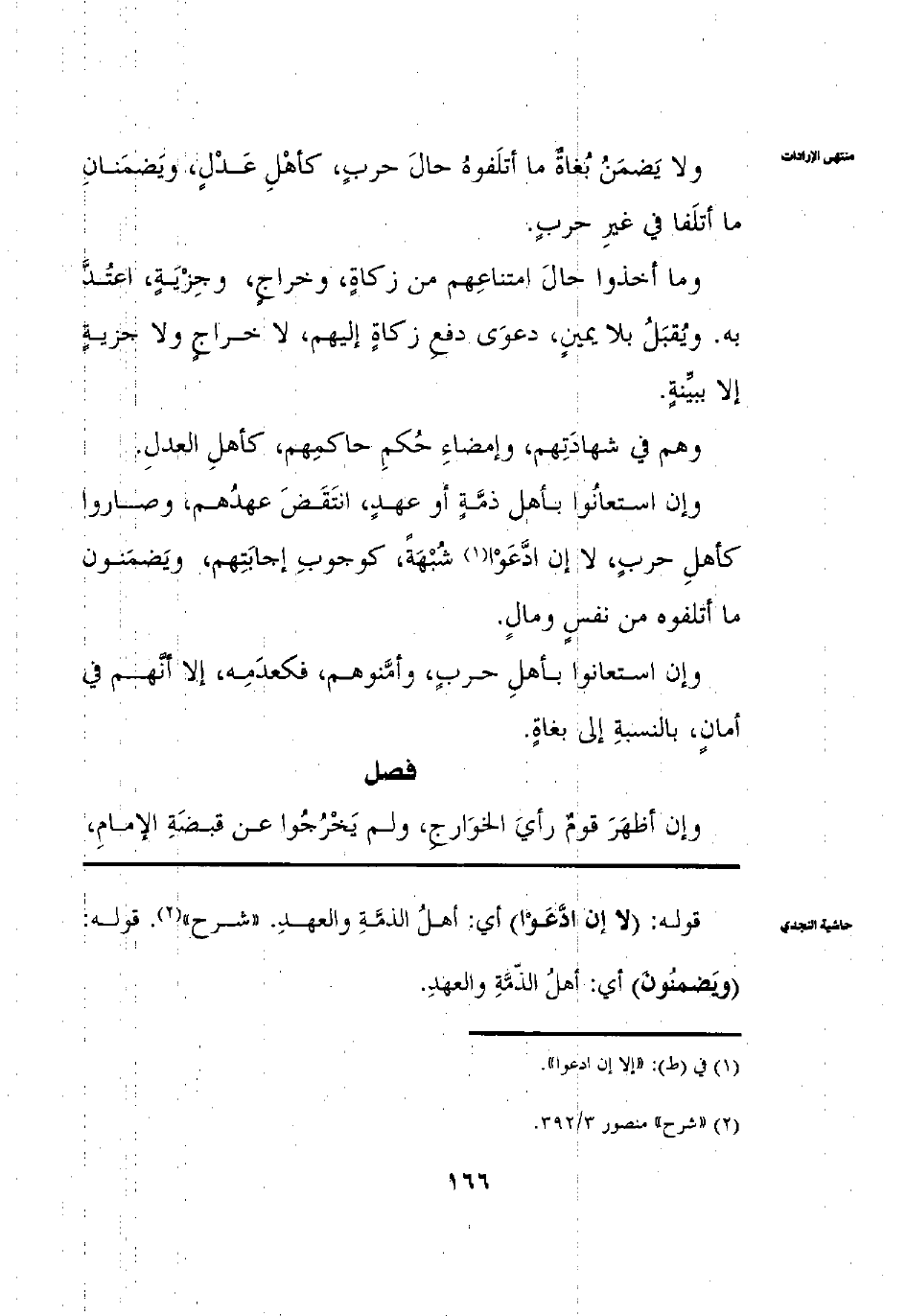 وَلَا يَضْمَنُ بُغَاةٌ مَا أَتْلَفُوهُ حال حرب كَأَهْلُ عَدْلٍ وَيَضْمَنَانِ مَا أَتْلَفَا فِي غَيْرِ حَرْبٍ وَمَا أَخَذُوا حَالَ امْتِنَاعِهِمْ مِنْ زَكَاةٍ وَخَرَاجٍ وَجِزْيَةٍ اُعْتُدَّ بِهِ وَيُقْبَلُ بِلَا يَمِينٍ دَعْوَى دَفْعِ زَكَاةٍ إلَيْهِمْ لَا خَرَاجٍ وَلَا جِزْيَةٍ إلَّا بِبَيِّنَةٍ وَهُمْ فِي شَهَادَتِهِمْ وإمْضَاءِ حُكْمِ حَاكِمِهِمْ كَأَهْلِ الْعَدْلِ وَإِنْ اسْتَعَانُوا بِأَهْلِ ذِمَّةٍ أَوْ أَهْلِ عَهْدٍ انْتَقَضَ عَهْدُهُمْ وَصَارُوا كُلُّهُمْ أَهْلَ حَرْبٍ إلَّا إنْ ادَّعَوْا شُبْهَةً كَوُجُوبِ إجَابَتِهِمْ وَيَضْمَنُونَ مَا أَتْلَفُوهُ مِنْ نَفْسٍ وَمَالٍ وَإِنْ اسْتَعَانُوا بِأَهْلِ حَرْبٍ وَأَمَّنُوهُمْ فكَعَدَمِهِ إلَّا أَنَّهُمْ فِي أَمَانٍ بِالنِّسْبَةِ إلَى بُغَاةٍ وَلَمْ يَخْرُجُوا عَنْ قَبْضَةِ الْإِمَامِ