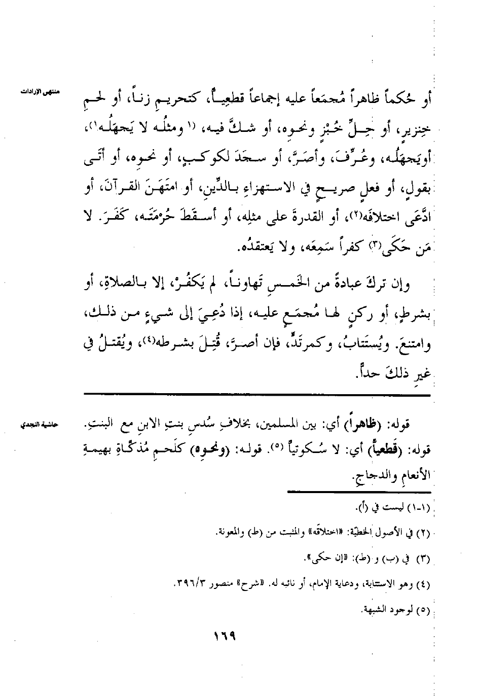 أَوْ حُكْمًا ظَاهِرًا مُجْمَعًا عَلَيْهِ إجْمَاعًا قَطْعِيًّا كَتَحْرِيمِ زِنًا أَوْ لَحْمِ خِنْزِيرٍ أَوْ حِلِّ خُبْزٍ وَنَحْوِهِ أَوْ شَكٍّ فِيهِ وَمِثْلُهُ لَا يَجْهَلُهُ أَوْ يَجْهَلُهُ وَعَرَفَ وَأَصَرَّ أَوْ سَجَدَ لِكَوْكَبٍ أَوْ نَحْوِهِ أَوْ أَتَى بِقَوْلٍ أَوْ فِعْلٍ صَرِيحٍ فِي الِاسْتِهْزَاءِ بِالدِّينِ أَوْ امْتَهَنَ الْقُرْآنَ أَوْ ادَّعَى اخْتِلَافَهُ أَوْ الْقُدْرَةَ عَلَى مِثْلِهِ أَوْ أَسْقَطَ حُرْمَتَهُ كَفَرَ وَلَا مَنْ حَكَى كُفْرًا سَمِعَهُ وَلَا يَعْتَقِدُهُ وَإِنْ تَرَكَ عِبَادَةً مِنْ الْخَمْسِ تَهَاوُنًا لَمْ يَكْفُرْ إلَّا بِالصَّلَاةِ أَوْ بِشَرْطٍ أَوْ رُكْنٍ لَهَا مُجْمَعٍ عَلَيْهِ إذَا اُدُّعِيَ إلَى شَيْء مِنْ ذَلِكَ وَامْتَنَعَ وَيُسْتَتَابُ كَمُرْتَدٍّ فَإِنْ وَإِنْ أَصَرَّ قُتِلَ بِشَرْطِهِ وَيُقْتَلُ فِي غَيْرِ ذَلِكَ حَدًّا