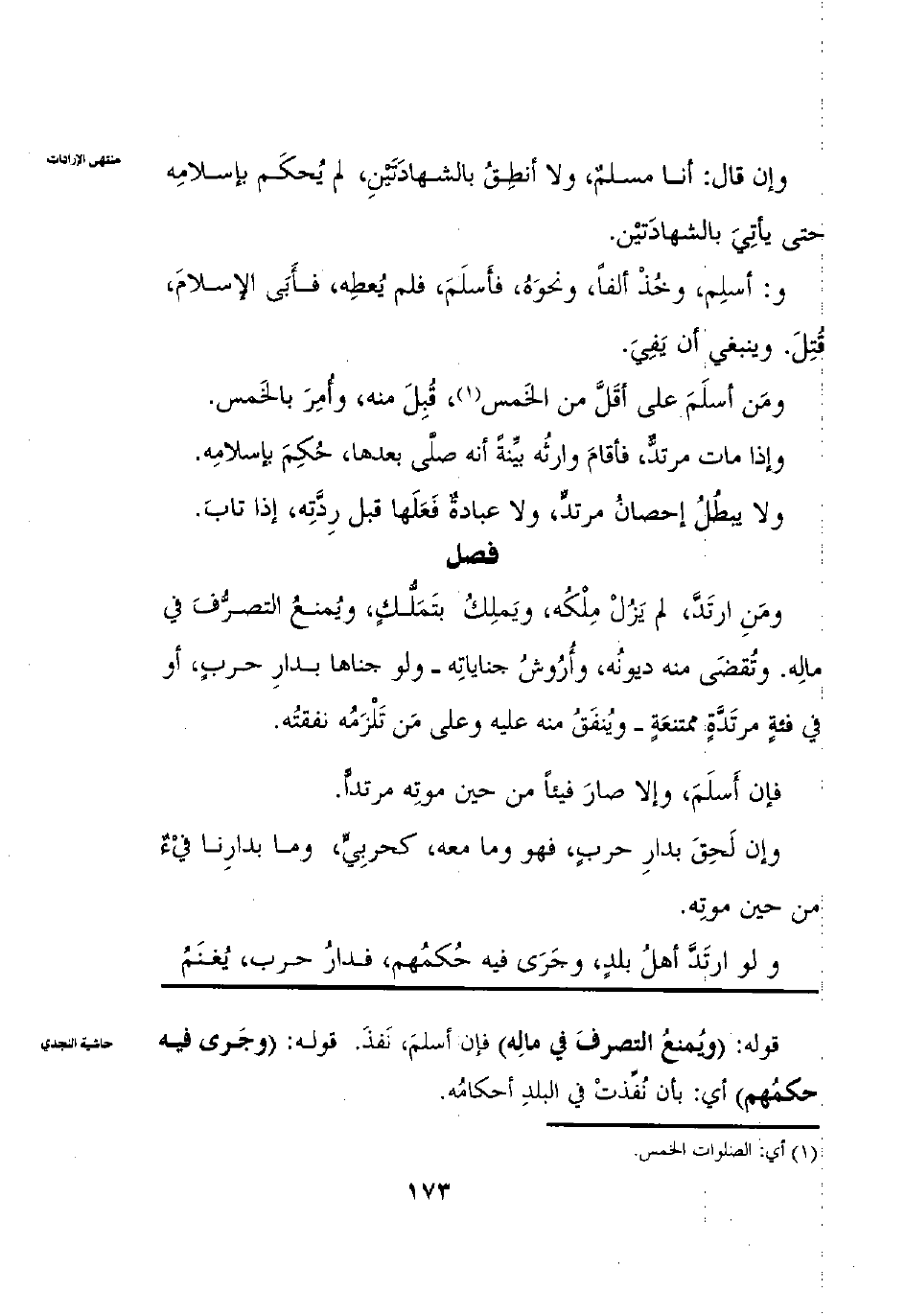 وَإِنْ قَالَ: أَنَا مُسْلِمٌ وَلَا أَنْطِقُ بِالشَّهَادَتَيْنِ لَمْ يُحْكَمْ بِإِسْلَامِهِ حَتَّى يَأْتِيَ بِالشَّهَادَتَيْنِ وأَسْلِمْ وَخُذْ أَلْفًا وَنَحْوَهُ فَأَسْلَمَ فَلَمْ يُعْطِهِ فَأَبَى الْإِسْلَامَ قُتِلَ وَيَنْبَغِي أَنْ يَفِيَ وَمَنْ أَسْلَمَ عَلَى أَقَلَّ مِنْ الْخَمْسِ قُبِلَ مِنْهُ وَأُمِرَ بِالْخَمْسِ وَإِذَا مَاتَ مُرْتَدٌّ فَأَقَامَ وَارِثُهُ الْمُسْلِمُ بَيِّنَةً أَنَّهُ صَلَّى بَعْدَهَا حُكِمَ بِإِسْلَامِهِ وَلَا يَبْطُلُ إحْصَانُ مُرْتَدٍّ وَلَا عِبَادَةٌ فَعَلَهَا قَبْلَ رِدَّتِهِ إذَا تَابَ وَيَمْلِكُ بِتَمَلُّكٍ وَيُمْنَعُ التَّصَرُّفَ فِي مَالِهِ وَتُقْضَى مِنْهُ دُيُونُهُ وَأُرُوشُ جِنَايَاتِهِ، وَلَوْ جَنَاهَا بِدَارِ حَرْبٍ أَوْ فِي فِئَةٍ مُرْتَدَّةٍ مُمْتَنِعَةٍ وَيُنْفَقُ مِنْهُ عَلَيْهِ وَعَلَى مَنْ تَلْزَمُهُ نَفَقَتُهُ فَإِنْ أَسْلَمَ وَإِلَّا صَارَ فَيْئًا مِنْ حِينِ مَوْتِهِ مُرْتَدًّا وَإِنْ لَحِقَ بِدَارِ حَرْبٍ فَهُوَ وَمَا مَعَهُ كَحَرْبِيٍّ ومَا بِدَارِنَا مِنْ حِينِ مَوْتِهِ وَلَوْ ارْتَدَّ أَهْلُ بَلَدٍ وَجَرَى فِيهِ حُكْمُهُمْ فدَارِ حَرْبٍ يُغْنَمُ