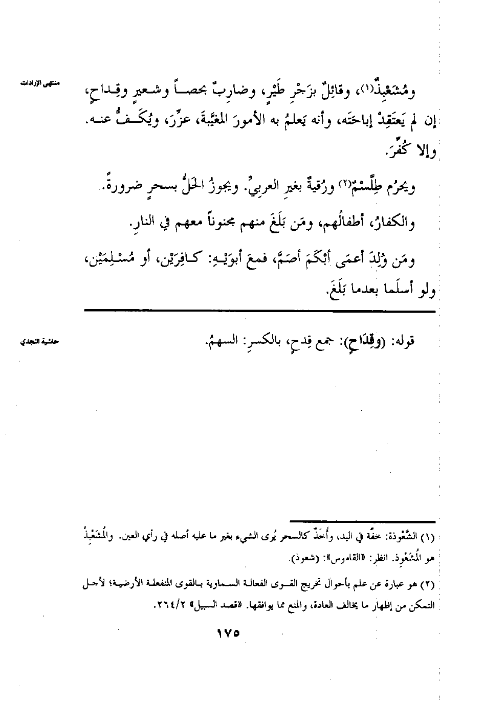 وَمُشَعْبِذٌ وَقَائِلٍ بِزَجْرِ طَيْرٍ وَضَارِبٌ بِحَصًى أَوْ شَعِيرٍ وقِدَاحٍ إنْ لَمْ يَعْتَقِدْ إبَاحَتَهُ وأَنَّهُ يَعْلَمُ بِهِ الْأُمُورَ الْمُغَيَّبَةَ عُزِّرَ وَيُكَفُّ عَنْهُ وَإِلَّا كَفَرَ وَيَحْرُمُ طَلْسَمٌ ورُقْيَةٌ بِغَيْرِ الْعَرَبِيِّ وَيَجُوزُ الْحَلُّ بِسِحْرٍ ضَرُورَةً وَالْكُفَّارُ وَأَطْفَالُهُمْ وَمَنْ بَلَغَ مِنْهُمْ مَجْنُونًا مَعَهُمْ عَلَى النَّارِ وَمَنْ وُلِدَ أَعْمَى أَبْكَمَ أَصَمَّ فمَعَ أَبَوَيْهِ كَافِرَيْنِ أَوْ مُسْلِمَيْنِ وَلَوْ أَسْلَمَا بَعْدَ مَا بَلَغَ