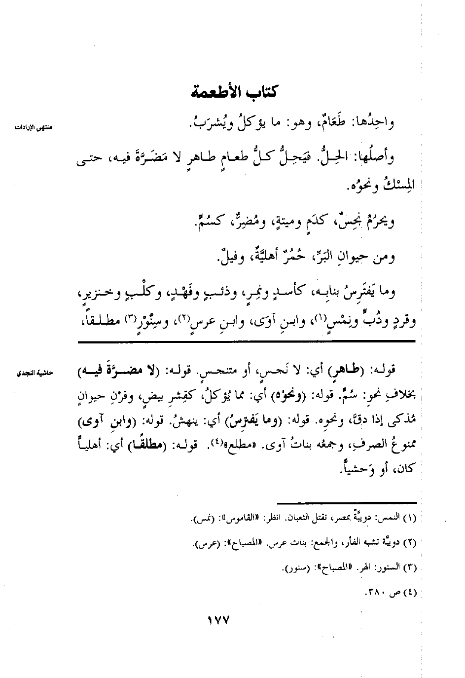 وَاحِدُهَا: طَعَامٌ، وَهُوَ مَا يُؤْكَلُ وَيُشْرَبُ وَأَصْلُهَا الْحِلُّ فَيَحِلُّ كُلُّ طَعَامٍ طَاهِرٍ لَا مَضَرَّةَ فِيهِ حَتَّى الْمِسْكِ وَنَحْوِهِ وَيَحْرُمُ نَجِسٌ كَدَمٍ وَمَيْتَةٍ ومُضِرٌّ كَسُمٍّ ومِنْ حَيَوَانِ الْبَرِّ حُمُرٌ أَهْلِيَّةٌ وَفِيلٍ ومَا يَفْتَرِسُ بِنَابِهِ كَأَسَدٍ وَنَمِرٍ وَذِئْبٍ وَفَهْدٍ وَكَلْبٍ وَخِنْزِيرٍ وَقِرْدٍ وَدُبٍّ وَنِمْسٍ وَابْنِ آوَى وَابْنِ عِرْسٍ وَسِنَّوْرٍ مُطْلَقًا