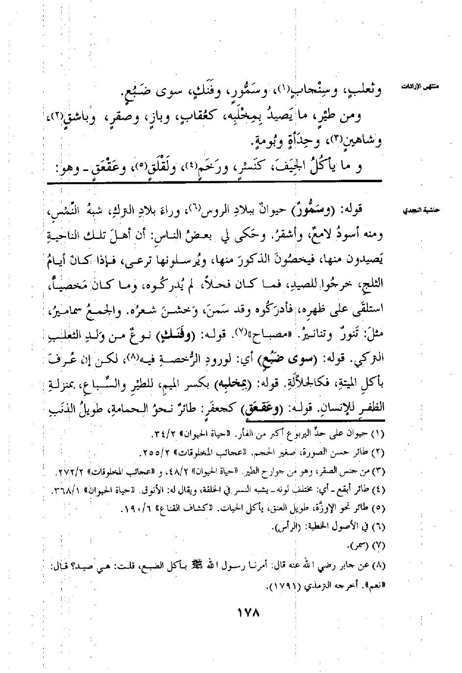 وَثَعْلَبٌ وَسِنْجَابٌ وَسَمُّورٌ وَفَنَكٌ سِوَى ضَبُعٍ ومِنْ طَيْرٍ مَا يَصِيدُ بِمِخْلَبِهِ كَعُقَابٍ وَبَازٍ وَصَقْرٍ وَبَاشِقٍ وَشَاهِينِ وَحِدَأَةٍ وَبُومَةٍ ومَا يَأْكُلُ الْجِيَفَ كَنِسْرٍ وَرَخَمٍ وَلَقْلَقٍ وَعَقْعَقٍ وَهُوَ