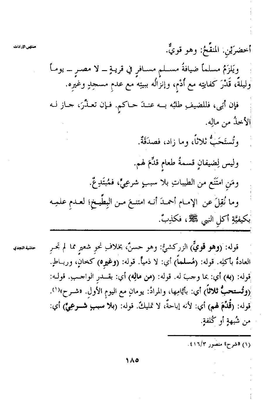 أَخْضَرَيْنِ الْمُنَقِّحُ وَهُوَ قَوِيٌّ وَيَلْزَمُ مُسْلِمًا ضِيَافَةُ مُسْلِمٍ مُسَافِرٍ فِي قَرْيَةٍ يَوْمًا وَلَيْلَةً قَدْرَ كِفَايَتِهِ مَعَ أُدْمٍ وإنْزَالُهُ بِبَيْتِهِ مَعَ عَدَمِ مَسْجِدٍ وَغَيْرِهِ فَإِنْ أَبَى فَلِلضَّيْفِ طَلَبُهُ بِهِ عِنْدَ الْحَاكِمِ فَإِنْ تَعَذَّرَ جَازَ لَهُ الْأَخْذُ مِنْ مَالِهِ وَتُسْتَحَبُّ ثَلَاثًا وَمَا زَادَ فصَدَقَةٌ وَلَيْسَ لِضِيفَانٍ قِسْمَةُ طَعَامٍ قُدِّمَ لَهُمْ وَمَنْ امْتَنَعَ مِنْ الطَّيِّبَاتِ بِلَا سَبَبٍ شَرْعِيٍّ فمُبْتَدِعٌ وَمَا نُقِلَ عَنْ أَحْمَدَ أَنَّهُ امْتَنَعَ مِنْ الْبِطِّيخِ لِعَدَمِ عِلْمِهِ بِكَيْفِيَّةِ أَكْلِ النَّبِيِّ صَلَّى اللَّهُ عَلَيْهِ وَسَلَّمَ فَكَذِبٌ.