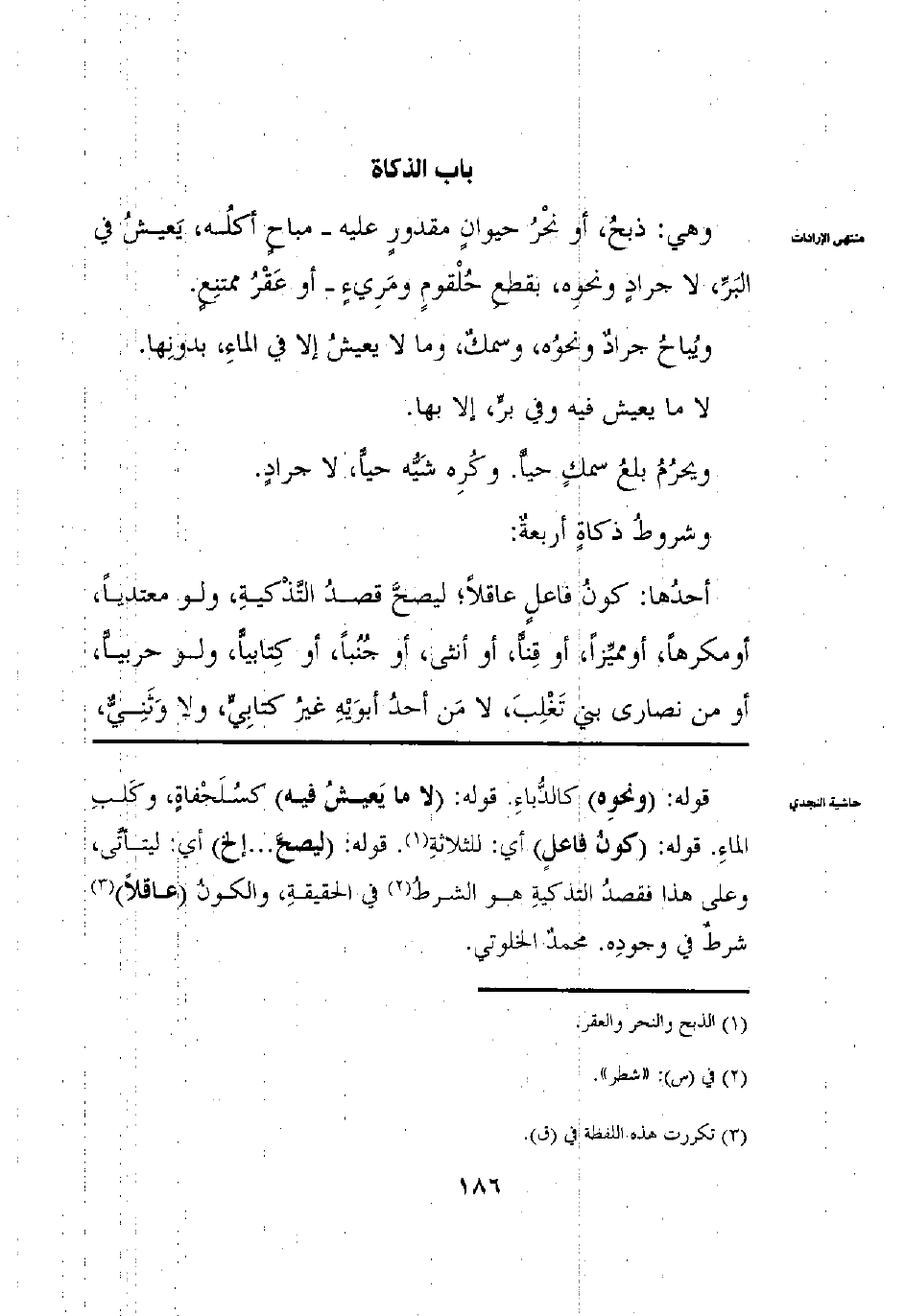 وَهِيَ ذَبْحُ أَوْ نَحْرُ حَيَوَانٍ مَقْدُورٍ عَلَيْهِ مُبَاحٌ أَكْلُهُ يَعِيشُ فِي الْبَرِّ لَا جَرَادٌ وَنَحْوُهُ بِقَطْعِ حُلْقُومٍ وَمَرِيءٍ أَوْ عَقْرُ مُمْتَنِعٍ وَيُبَاحُ جَرَادٌ وَنَحْوُهُ وسَمَكٌ وَمَا لَا يَعِيشُ إلَّا فِي الْمَاءِ بِدُونِهَا لَا مَا يَعِيشُ فِيهِ وَفِي بَرٍّ إلَّا بِهَا وَيَحْرُمُ بَلْعُ سَمَكٍ حَيًّا وَكُرِهَ شَيُّهُ حَيًّا لَا جَرَادٍ وَشُرُوطُ ذَكَاةٍ أَرْبَعَةٌ أَحَدُهَا كَوْنُ فَاعِلٍ عَاقِلًا لِيَصِحَّ قَصْدُ التَّذْكِيَةِ وَلَوْ مُعْتَدِيًا أَوْ مُكْرَهًا أَوْ مُمَيِّزًا أَوْ قِنًّا أَوْ أُنْثَى أَوْ جُنُبًا أَوْ كِتَابِيًّا وَلَوْ حَرْبِيًّا أَوْ مِنْ نَصَارَى بَنِي تَغْلِبَ لَا مَنْ أَحَدُ أَبَوَيْهِ غَيْرَ كِتَابِيٍّ وَلَا وَثَنِيٍّ