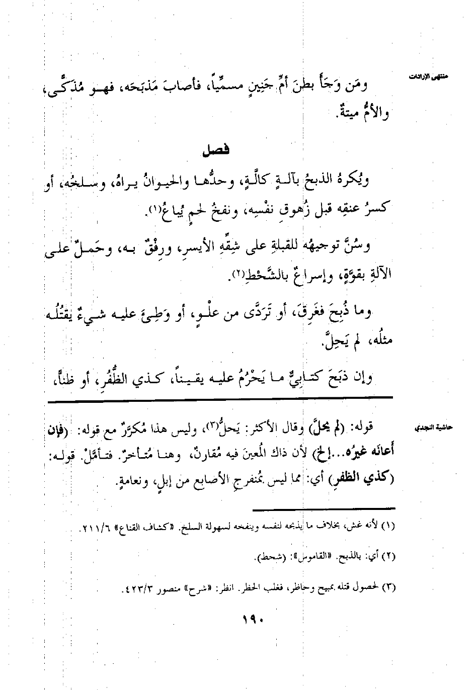 ويكره الذبح بآلة كآلة وحَدُّهَا وَالْحَيَوَانُ يَرَاهُ وسَلْخُهُ أَوْ كَسْرُ عُنُقِهِ قَبْلَ زُهُوقِ نَفْسِهِ ونَفْخُ لَحْمٍ يُبَاعُ وَسُنَّ تَوْجِيهُهُ لِلْقِبْلَةِ عَلَى شِقِّهِ الْأَيْسَرِ وَرِفْقٌ بِهِ وَحَمْلٌ عَلَى الْآلَةِ بِقُوَّةٍ وَإِسْرَاعٌ بِالشَّحْطِ وَمَا ذُبِحَ فَغَرِقَ أَوْ تَرَدَّى مِنْ عُلْوٍ أَوْ وَطِئَ عَلَيْهِ شَيْءٌ يَقْتُلُ مِثْلُهُ لَمْ يَحِلَّ وَإِنْ ذَبَحَ كِتَابِيٌّ مَا يَحْرُمُ عَلَيْهِ يَقِينًا كَذِي الظُّفُرِ أَوْ ظَنًّا