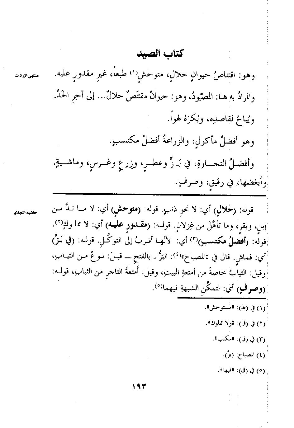 وهو: اقْتِنَاصُ حَيَوَانٍ حَلَالٍ مُسْتَوْحَشٍ طَبْعًا غَيْرِ مَقْدُورٍ عَلَيْهِ وَالْمُرَادُ بِهِ هُنَا الْمَصْيُودُ وَهُوَ حَيَوَانٌ مُقْتَنَصٌ حَلَالٌ إلَى آخِرِ الْحَدِّ وَيُبَاحُ لِقَاصِدِهِ وَيُكْرَهُ لَهْوًا وَهُوَ أَفْضَلُ مَأْكُولٍ وَالزِّرَاعَةُ أَفْضَلُ مُكْتَسَبٍ وَأَفْضَلُ التِّجَارَةِ التِّجَارَةُ فِي بَزٍّ وَعِطْرٍ وَزَرْعٍ وَغَرْسٍ وَمَاشِيَةٍ وَأَبْغَضُهَا فِي رَقِيقٍ وَحِرَفٍ