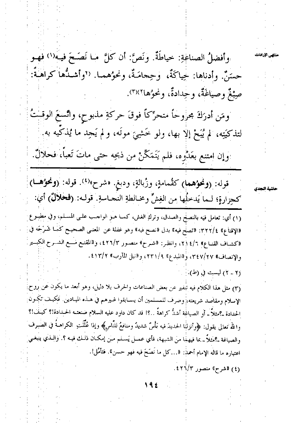 وَأَفْضَلُ الصِّنَاعَةِ خِيَاطَةٌ وَنَصَّر إنَّ كُلَّ مَا نُصِحَ فِيهِ فحَسَنٌ وَأَرْدَؤُهَا حِيَاكَةٌ وَحِجَامَةٌ وَنَحْوُهُمَا وَأَشَدُّهَا كَرَاهَةً صَبْغٌ وَصِيَاغَةٌ وَحِدَادَةٌ وَنَحْوُهَا وَمَنْ أَدْرَكَ مَجْرُوحًا مُتَحَرِّكًا فَوْقَ حَرَكَةِ مَذْبُوحٍ، وَاتَّسَعَ الْوَقْتُ لِتَذْكِيَتِهِ لَمْ يُبَحْ إلَّا بِهَا وَلَوْ خَشَى مَوْتَهُ، وَلَمْ يَجِدْ مَا يُذَكِّيهِ بِهِ وَإِنْ امْتَنَعَ بِعَدْوِهِ فَلَمْ يَتَمَكَّنْ مِنْ ذَبْحِهِ حَتَّى مَاتَ تَعَبًا فحَلَالٌ