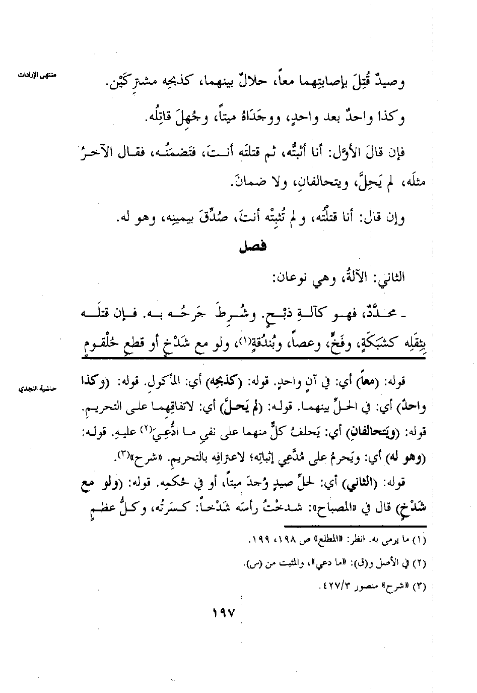 الثاني: الْآلَةُ وَهِيَ نَوْعَانِ مُحَدَّدُ فَهُوَ كَآلَةِ ذَبْحٍ وَشَرْطُ جَرْحِهِ بِهِ فَإِنْ قَتَلَهُ بِثِقَلِهِ كَشَبَكَةٍ وَفَخٍّ وَعَصَا وَبُنْدُقَةٍ وَلَوْ مَعَ شَدْخٍ أَوْ قَطْعِ حُلْقُومٍ