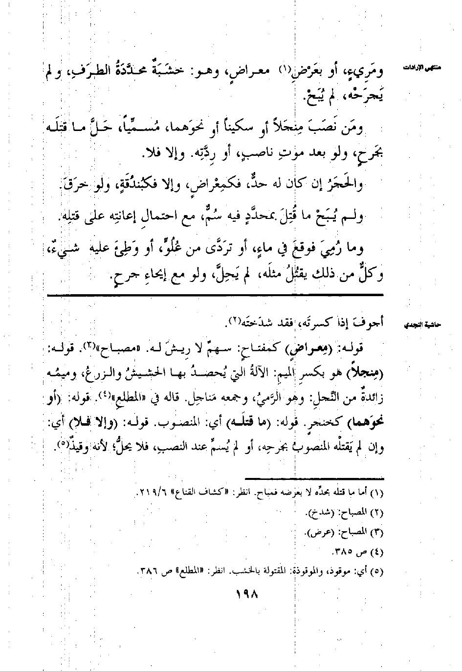 وَمَرِيءٍ أَوْ بِعَرْضِ مِعْرَاضٍ وَهُوَ خَشَبَةٌ مُحَدَّدَةُ الطَّرَفِ وَلَمْ يَجْرَحْهُ لَمْ يُبَحْ وَمَنْ نَصَبَ مِنْجَلًا أَوْ سِكِّينًا أَوْ نَحْوَهُمَا مُسَمِّيًا حَلَّ مَا قَتَلَهُ بِجُرْحٍ وَلَوْ بَعْدَ مَوْتِ نَاصِبٍ أَوْ رِدَّتِهِ وَإِلَّا فَلَا وَالْحَجَرُ إنْ كَانَ لَهُ حَدٌّ فَكَمِعْرَاضٍ وَإِلَّا فَكَبُنْدُقَةٍ وَلَوْ خَرَقَ وَلَمْ يُبَحْ مَا قُتِلَ بِمُحَدَّدٍ فِيهِ سُمٌّ مَعَ احْتِمَالِ إعَانَتِهِ عَلَى قَتْلِهِ وَمَا رُمِيَ فَوَقَعَ فِي مَاءٍ أَوْ تَرَدَّى مِنْ عُلْوٍ أَوْ وَطِئَ عَلَيْهِ شَيْءٌ وَكُلٌّ مِنْ ذَلِكَ يَقْتُلُ مِثْلُهُ لَمْ يَحِلَّ وَلَوْ مَعَ إيحَاءِ جُرْحٍ