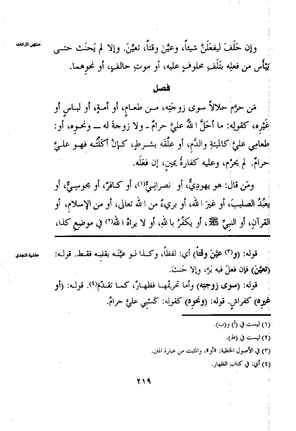 من حرم حلالا سوى زوجته من طعام أو أمة أو لباس أو غيره كَقَوْلِهِ مَا أَحَلَّ اللَّهُ عَلَيَّ حَرَامٌ وَلَا زَوْجَةَ أَوْ نَحْوَهُ أَوْ طَعَامِي عَلَيَّ كَالْمَيْتَةِ وَالدَّمِ أَوْ عَلَّقَهُ بِشَرْطٍ كَإنْ أَكَلْته فَهُوَ عَلَيَّ حَرَامٌ لَمْ يَحْرُمْ وَعَلَيْهِ كَفَّارَةُ يَمِينٍ إنْ فَعَلَهُ وَمَنْ قَالَ هُوَ يَهُودِيٌّ أَوْ نَصْرَانِيٌّ أَوْ هُوَ يَعْبُدُ الصَّلِيبَ أَوْ غَيْرَ اللَّهِ أَوْ بَرِيءٌ مِنْ اللَّهِ أَوْ مِنْ الْإِسْلَامِ أَوْ الْقُرْآنِ أَوْ أَوْ يَكْفُرُ بِاَللَّهِ أَوْ لَا يَرَاهُ فِي مَوْضِعٍ كَذَا أَوْ يَكْفُرُ بِاَللَّهِ أَوْ لَا يَرَاهُ فِي مَوْضِعِ كَذَا