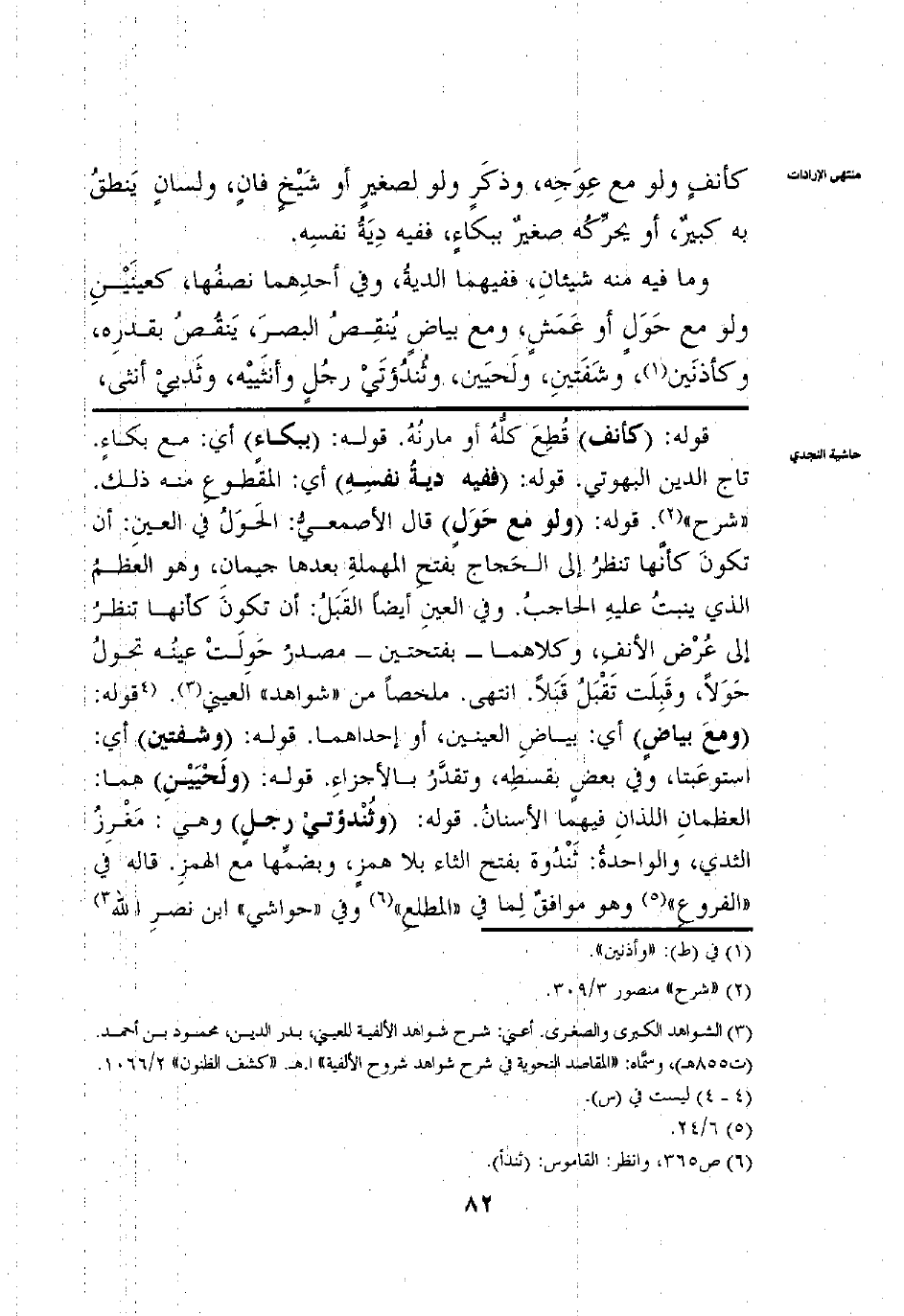 كَأَنْفٍ وَلَوْ مَعَ عِوَجِهِ وذَكَرٍ وَلَوْ لِصَغِيرٍ أَوْ شَيْخٍ فَانٍ ولِسَانٍ يَنْطِقُ بِهِ كَبِيرٌ أَوْ يُحَرِّكُهُ صَغِيرٌ بِبُكَاءٍ فَفِيهِ دِيَةُ نَفْسِهِ وَمَا فِيهِ مِنْهُ شَيْئَانِ فَفِيهِمَا الدِّيَةُ وَفِي أَحَدِهِمَا نِصْفُهَا كَعَيْنَيْنِ وَلَوْ مَعَ حَوَلٍ أَوْ عَمَشٍ وَمَعَ بَيَاضٍ يُنْقِصُ الْبَصَرَ تَنْقُصُ بِقَدْرِهِ وأُذُنَيْنِ وَشَفَتَيْنِ ولَحْيَيْنِ وثَنْدُوَتَيْ رَجُلٍ وأُنْثَيَيْهِ وثَدْيَيْ أُنْثَى