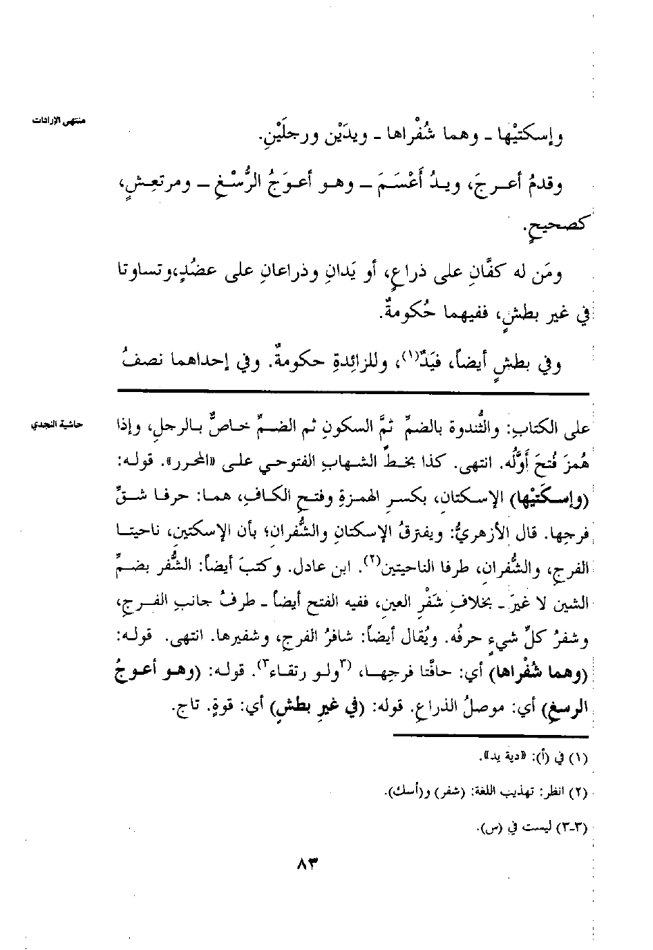 وَإِسْكَتَيْهَا وَهُمَا شَفْرَاهَا ويَدَيْنِ وَرِجْلَيْنِ وَقَدَمُ أَعْرَجَ وَيَدُ أَعْسَمٍ وَهُوَ أَعْوَجُ الرُّسْغِ ومُرْتَعِشٌ كَصَحِيحٍ لِلتَّسَاوِي فِي الْبَطْشِ وَمَنْ لَهُ كَفَّانِ عَلَى ذِرَاعٍ أَوْ يَدَانِ وَذِرَاعَانِ عَلَى عَضُدٍ وَتَسَاوَتَا فِي غَيْرِ بَطْشٍ فَفِيهَا حُكُومَةٌ وفِي بَطْشٍ أَيْضًا فيَدٍ وَلِلزَّائِدَةِ حُكُومَةٌ، وَفِي إحْدَاهُمَا نِصْفُ