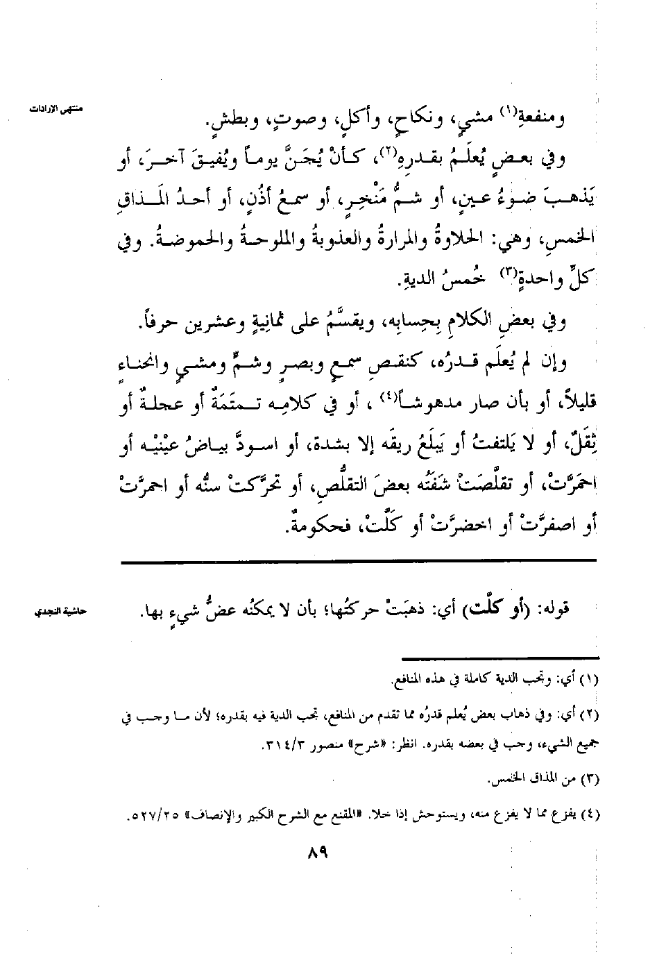 ومَنْفَعَةِ مَشْيٍ ونِكَاحٍ وأَكْلٍ وصَوْتٍ وبَطْشٍ وفِي بَعْضٍ يُعْلَمُ بِقَدْرِهِ كَأَنْ يُجَنُّ يَوْمًا وَيُفِيقُ آخَرَ. أَوْ يَذْهَبُ ضَوْءُ عَيْنٍ أَوْ شَمُّ مَنْخَرٍ أَوْ سَمْعُ أُذُنٍ أَوْ أَحَدُ الْمَذَاقِ الْخَمْسِ وَهِيَ: الْحَلَاوَةُ وَالْمَرَارَةُ وَالْعُذُوبَةُ وَالْمُلُوحَةِ وَالْحُمُوضَةِ وَفِي كُلِّ وَاحِدَةٍ خُمْسُ الدِّيَةِ وفِي بَعْضِ الْكَلَامِ بِحِسَابِهِ وَيُقَسَّمُ عَلَى ثَمَانِيَةٍ وَعِشْرِينَ حَرْفًا وَإِنْ لَمْ يُعْلَمْ قَدْرُهُ كَنَقْصِ سَمْعٍ وَبَصَرٍ وَشَمٍّ وَمَشْيٍ وَانْحِنَاءٍ قَلِيلًا أَوْ بِأَنْ صَارَ مَدْهُوشًا أَوْ فِي كَلَامِهِ تَمْتَمَةٌ أَوْ عَجَلَةٌ أَوْ ثَقُلَ أَوْ أَوْ يَبْلَعُ رِيقَهُ إلَّا بِشِدَّةٍ أَوْ اسْوَدَّ بَيَاضُ عَيْنَيْهِ أَوْ احْمَرَّ أَوْ تَقَلَّصَتْ شَفَتُهُ بَعْضَ التَّقَلُّصِ أَوْ تَحَرَّكَتْ سِنُّهُ أَوْ احْمَرَّتْ أَوْ اصْفَرَّتْ أَوْ اخْضَرَّتْ أَوْ كَلَّتْ حُكُومَةٌ