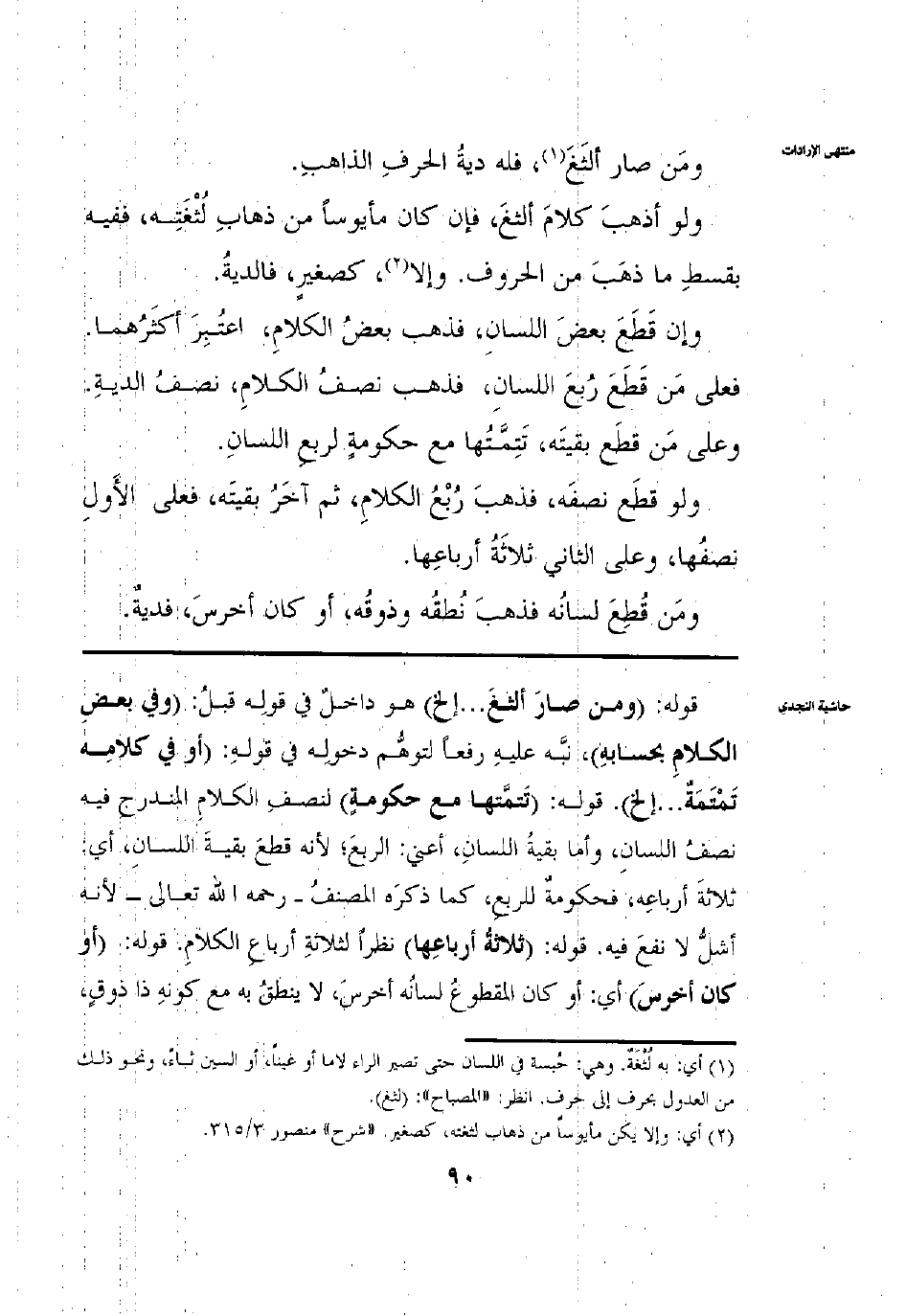 وَمَنْ صَارَ أَلْثَغَ فَلَهُ دِيَةُ الْحَرْفِ الذَّاهِبِ وَلَوْ أَذْهَبَ كَلَامَ أَلْثَغَ فَإِنْ كَانَ مَأْيُوسًا مِنْ ذَهَابِ لُثْغَتِهِ فَفِيهِ بِقِسْطِ مَا ذَهَبَ مِنْ الْحُرُوفِ وَإِلَّا كَصَغِيرٍ فالدِّيَةُ وَإِنْ قُطِعَ بَعْضُ اللِّسَانِ فَذَهَبَ بَعْضُ الْكَلَامِ اُعْتُبِرَ أَكْثَرُهُمَا فَعَلَى مَنْ قَطَعَ رُبْعَ اللِّسَانِ فَذَهَبَ نِصْفُ الْكَلَامِ نِصْفُ الدِّيَةِ وَعَلَى مَنْ قَطَعَ بَقِيَّتَهُ تَتِمَّتُهَا مَعَ حُكُومَةٍ لِرُبْعِ اللِّسَانِ وَلَوْ قَطَعَ نِصْفَهُ فَذَهَبَ رُبْعُ الْكَلَامِ ثُمَّ آخَرُ بَقِيَّتَهُ فَعَلَى الْأَوَّلِ نِصْفُهَا وَعَلَى الثَّانِي ثَلَاثَةُ أَرْبَاعِهَا وَمَنْ قُطِعَ لِسَانُهُ فَذَهَبَ نُطْقُهُ وَذَوْقُهُ أَوْ كَانَ أَخْرَسَ فدِيَةٌ