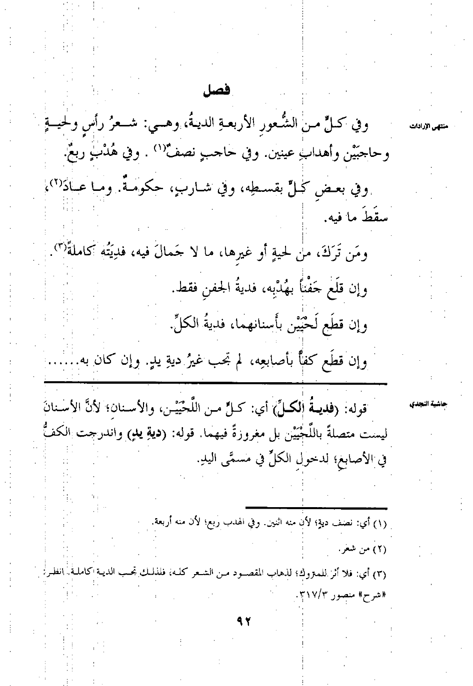 وفي كل من الشعور الأربعة الدية وَهِيَ شَعْرُ رَأْسٍ ولِحْيَةٍ وحَاجِبَيْنِ وأَهْدَابِ عَيْنَيْنِ وَفِي حَاجِبٍ نِصْفُ وَفِي هُدْبٍ رُبْعُ وَفِي بَعْضِ كُلٍّ بِقِسْطِهِ وَفِي شَارِبٍ حُكُومَةٌ وَمَا عَادَ سَقَطَ مَا فِيهِ وَمَنْ تَرَكَ مِنْ لِحْيَةٍ أَوْ غَيْرِهَا فدِيَتُهُ كَامِلَةٌ وَإِنْ قَلَعَ جَفْنًا بِهُدْبِهِ فَدِيَةُ الْجَفْنِ فَقَطْ وَإِنْ قَطَعَ لَحْيَيْنِ بِأَسْنَانِهِمَا فدِيَةُ الْكُلِّ وَإِنْ قَطَعَ كَفًّا بِأَصَابِعِهِ لَمْ تَجِبْ غَيْرُ دِيَةِ يَدٍ وَإِنْ كَانَ بِهِ