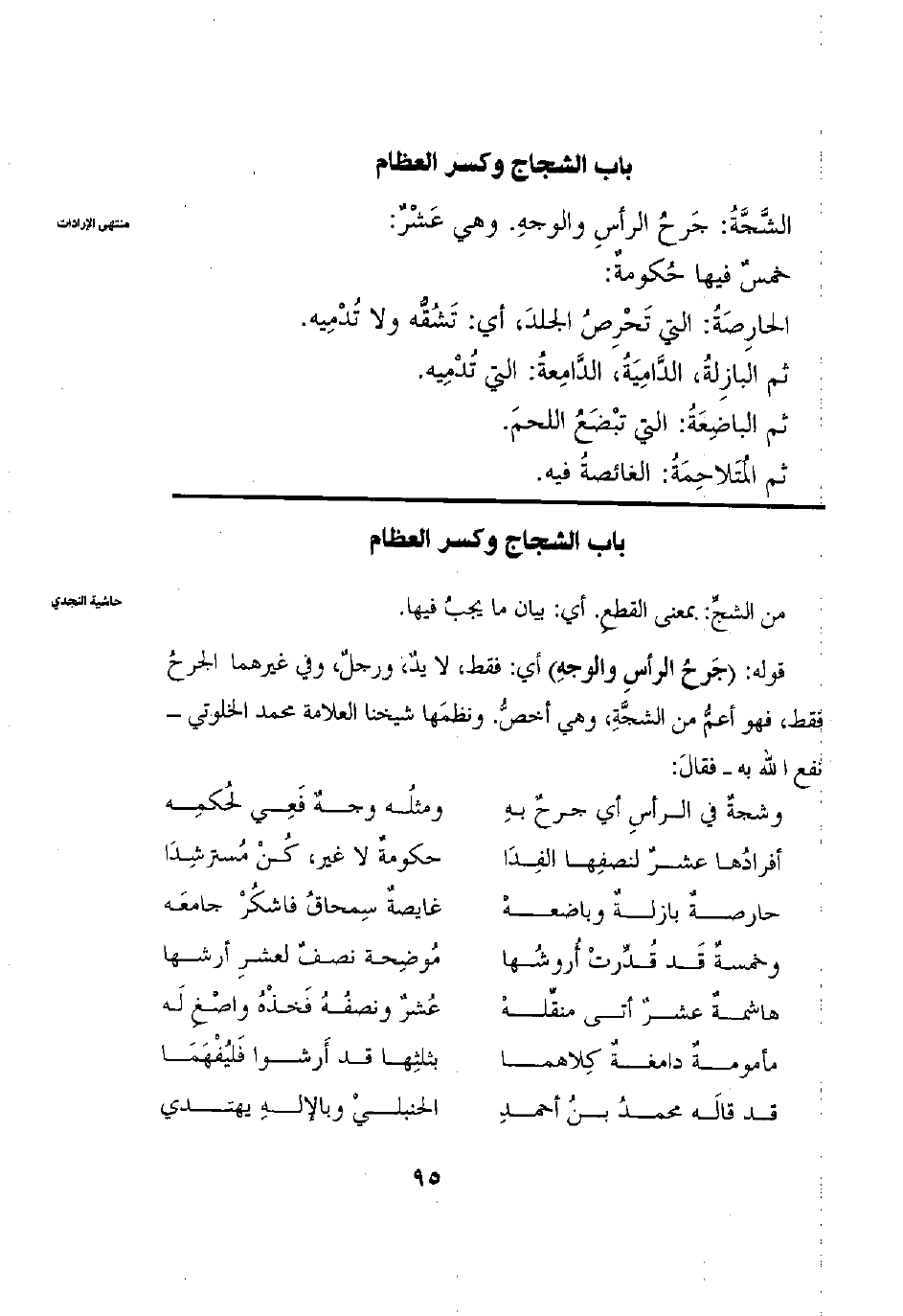 الشَّجَّةُ: جُرْحُ الرَّأْسِ وَالْوَجْهِ وَهِيَ عَشْرٌ خَمْسٌ فِيهَا حُكُومَةٌ الْحَارِصَةُ الَّتِي تَحْرِصُ الْجِلْدَ، أَيْ: تَشُقُّهُ وَلَا تُدْمِيهِ ثُمَّ الْبَاذِلَةُ: الدَّامِيَةُ الدَّامِعَةُ الَّتِي تُدْمِيهِ ثُمَّ الْبَاضِعَةُ الَّتِي تُبْضِعُ اللَّحْمَ ثُمَّ الْمُتَلَاحِمَةُ الْغَائِصَةُ فِيهِ