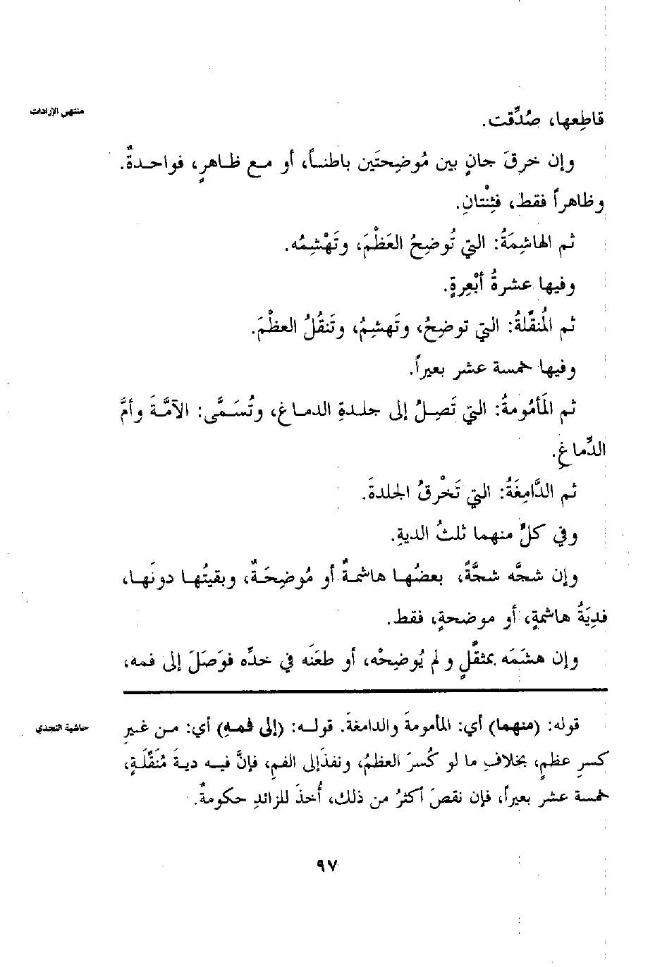 قَاطِعِهَا صُدِّقَتْ وَإِنْ خَرَقَ جَانٍ بَيْنَ مُوضِحَتَيْنِ بَاطِنًا أَوْ مَعَ ظَاهِرٍ فوَاحِدَةً وَإِنْ ظَاهِرًا فَقَطْ فثِنْتَانِ ثُمَّ الْهَاشِمَةُ الَّتِي تُوضِحُ الْعَظْمَ وَتُهَشِّمُهُ وَفِيهَا عَشَرَةُ أَبْعِرَةٍ ثُمَّ الْمُنَقِّلَةُ الَّتِي تُوضِحُ وَتُهَشِّمُ وَتُنَقِّلُ الْعَظْمَ، وَفِيهَا خَمْسَةَ عَشَرَ بَعِيرًا ثُمَّ الْمَأْمُومَةُ الَّتِي تَصِلُ إلَى جِلْدَةِ الدَّمِ وَتُسَمَّى الْآمَّةَ وأُمَّ الدِّمَاغِ ثُمَّ الدَّامِغَةُ الَّتِي تَخْرِقُ الْجِلْدَةَ وَفِي كُلٍّ مِنْهُمَا ثُلُثُ الدِّيَةِ وَإِنْ شَجَّهُ شَجَّةً بَعْضُهَا هَاشِمَةٌ أَوْ مُوضِحَةٌ وَبَقِيَّتُهَا دُونَهَا فدِيَةُ هَاشِمَةٍ أَوْ مُوضِحَةٍ فَقَطْ وَإِنْ هَشَّمَهُ بِمُثَقِّلٍ وَلَمْ يُوضِحْهُ أَوْ طَعَنَهُ فِي خَدِّهِ فَوَصَلَ إلَى فَمِهِ