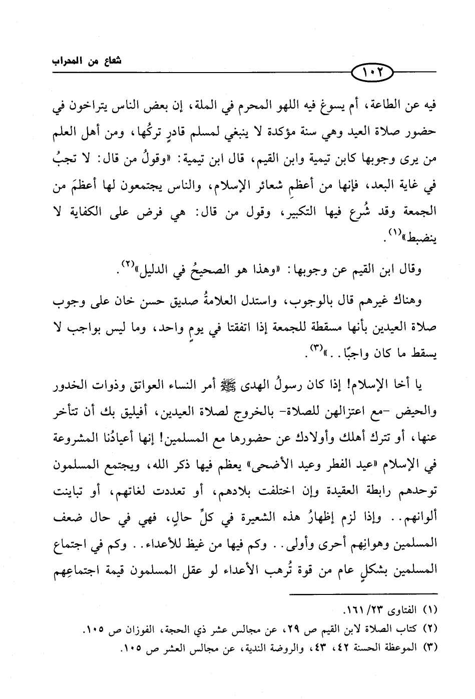 فيه عن الطاعة، أم يسوغ فيه اللهو المحرم من الملة، إن بعض الناس يتراخون في حضور صلاة العيد وهي سنة مؤكدة لا ينبغي لمسلم قادرٍ تركُها، ومن أهل العلم من يرى وجوبها كابن تيمية وابن القيم، قال ابن تيمية: ((وقولُ من قال: لا تجبُ في غاية البعد، فإنها من أعظمِ شعائر الإسلام، والناس يجتمعون لها أعظمَ من الجمعة وقد شُرع فيها التكبير، وقول من قال: هي فرض على الكفاية لا ينضبط)) (¬1).