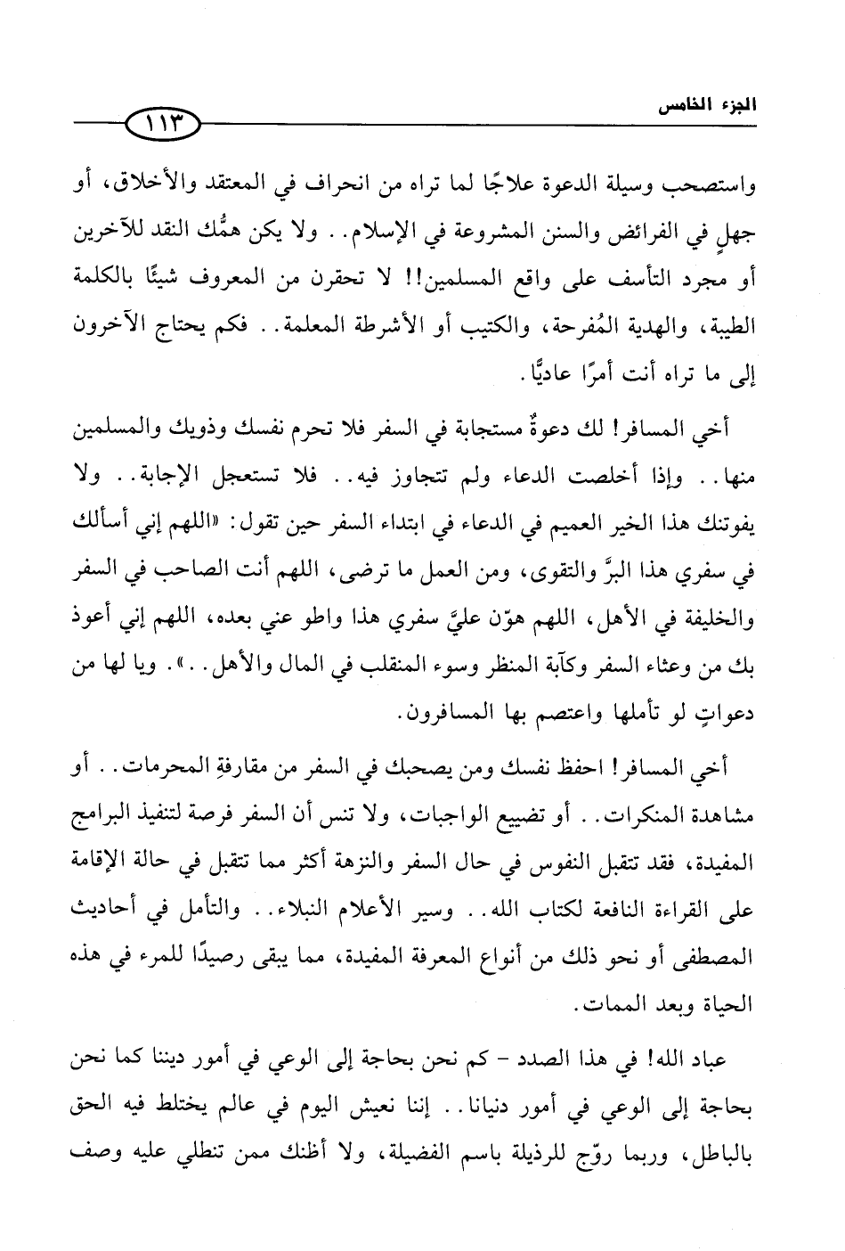 أخي المسافر! احفظ نفسك ومن يصحبك في السفر من مقارفةِ المحرمات .. أو مشاهدة المنكرات .. أو تضييع الواجبات، ولا تنس أن السفر فرصة لتنفيذ البرامج المفيدة، فقد تتقبل النفوس في حال السفر والنزهة أكثر مما تتقبل في حالة الإقامة على القراءة النافعة لكتاب الله .. وسير الأعلام النبلاء .. والتأمل في أحاديث المصطفى أو نحو ذلك من أنواع المعرفة المفيدة، مما يبقى رصيدًا للمرء في هذه الحياة وبعد الممات.